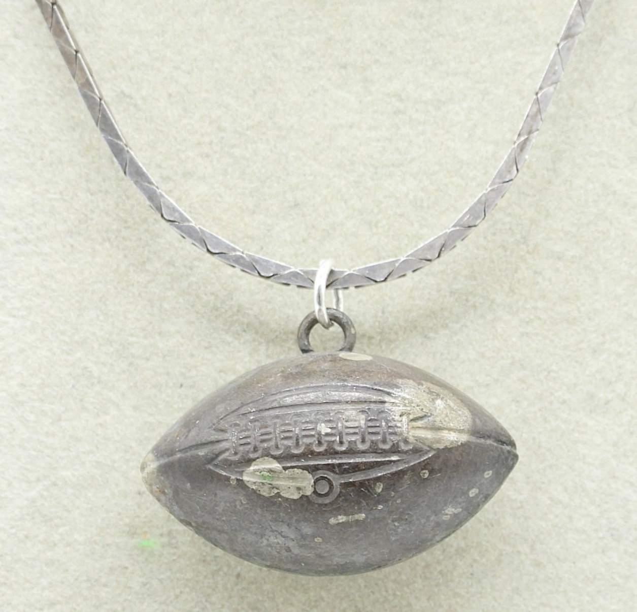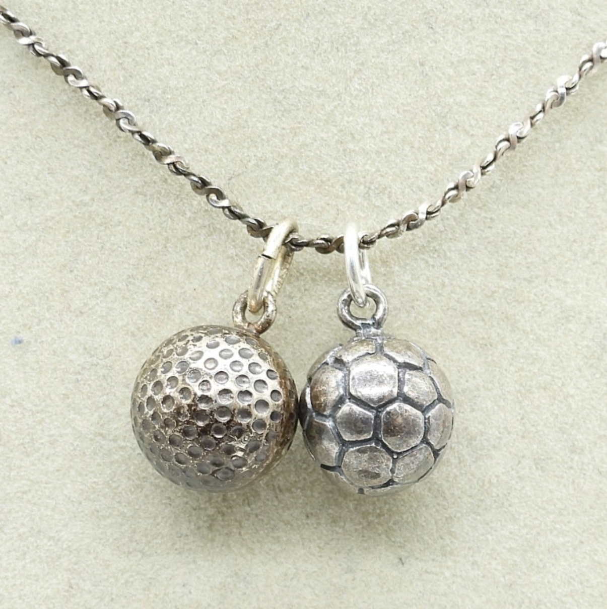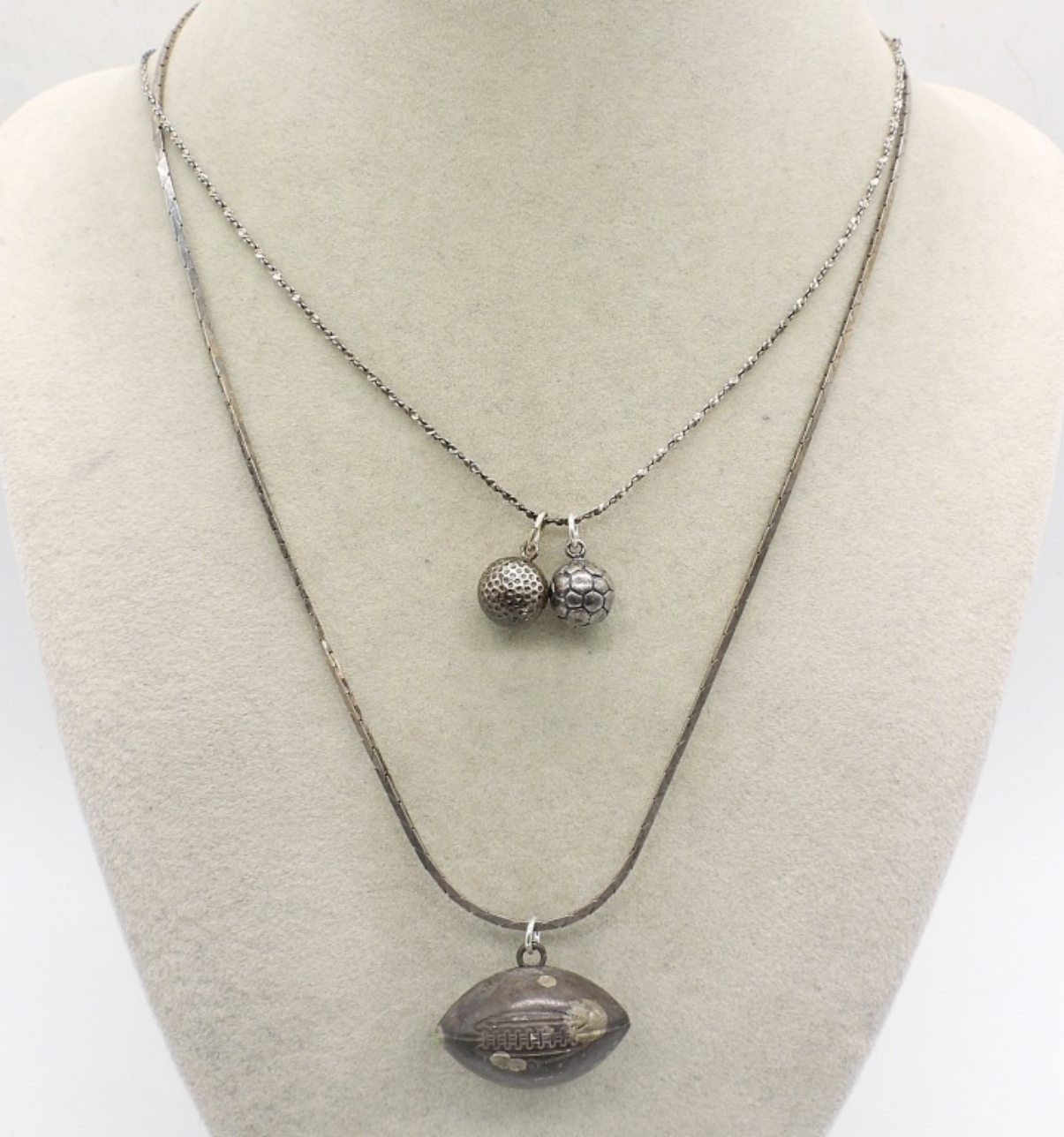 FOOTBALL NECKLACE, TESTED STERLING! 18″. TINY SOCCER & GOLF BALL CHARMS (TESTED STERLING) ON A 18″ STERLING CHAIN. (11.9 DWT)