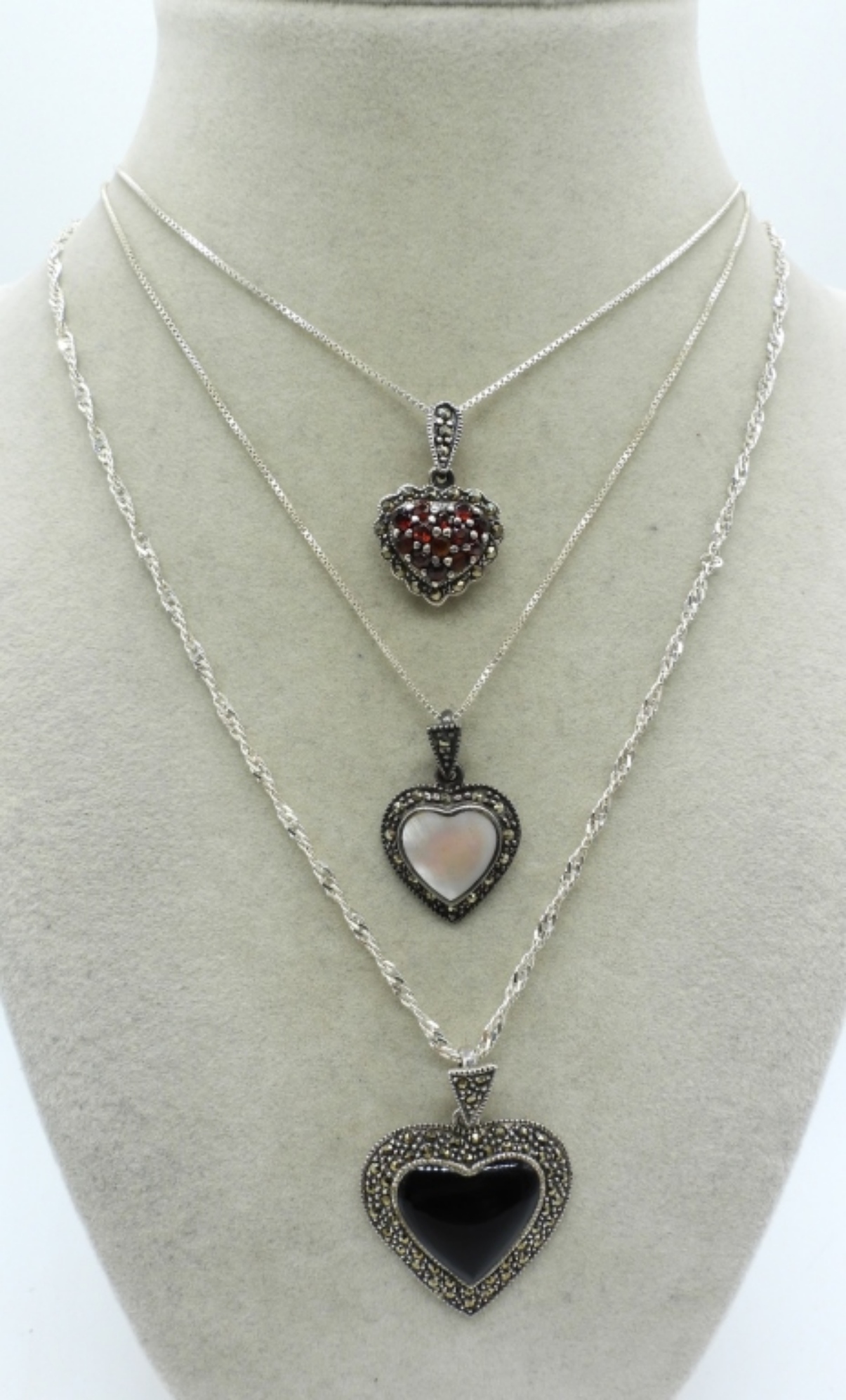 THREE STERLING GEMSTONE HEART PENDANTS ON 16-18″ STERLING CHAINS. MOTHER OF PEARL, BLACK ONYX & SIMULATED RUBIES. (12.7 DWT)