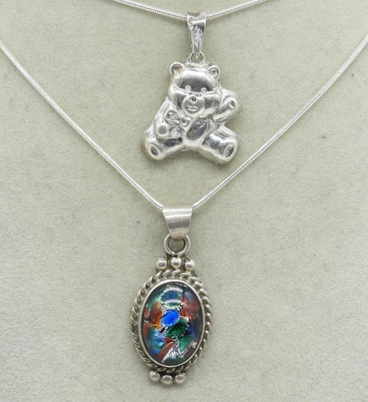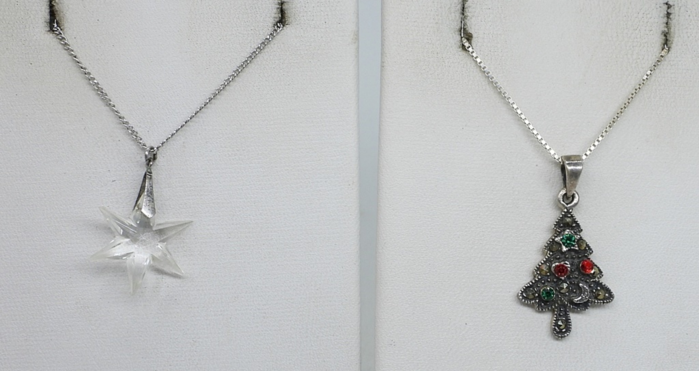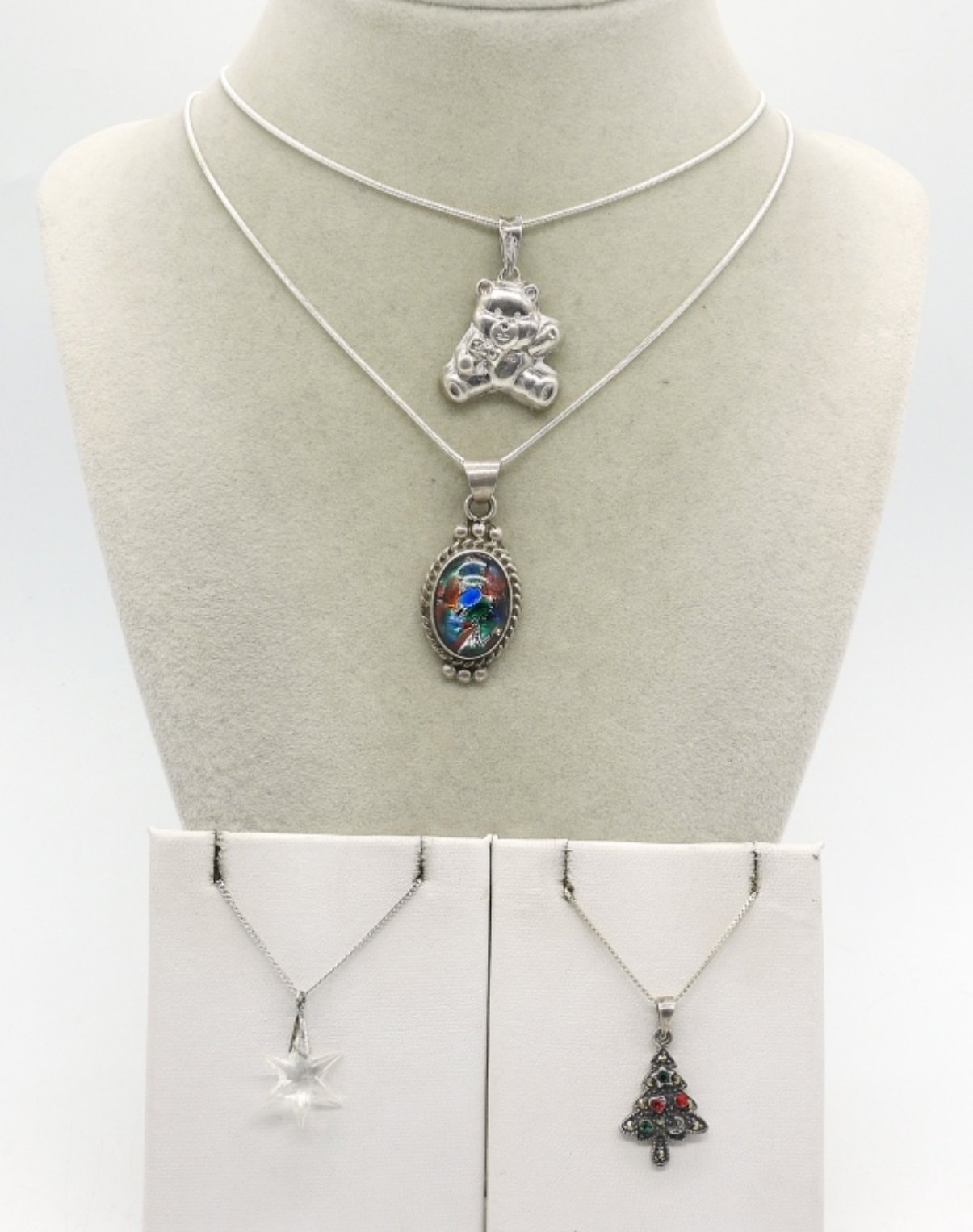 FOUR STERLING FASHION NECKLACES. MEXICO MULTI COLOR GLASS CABOCHON, BEAR, CHRISTMAS TREE & CRYSTAL STAR. CHAINS ARE 14″, 18″ & 22″ (20 DWT)