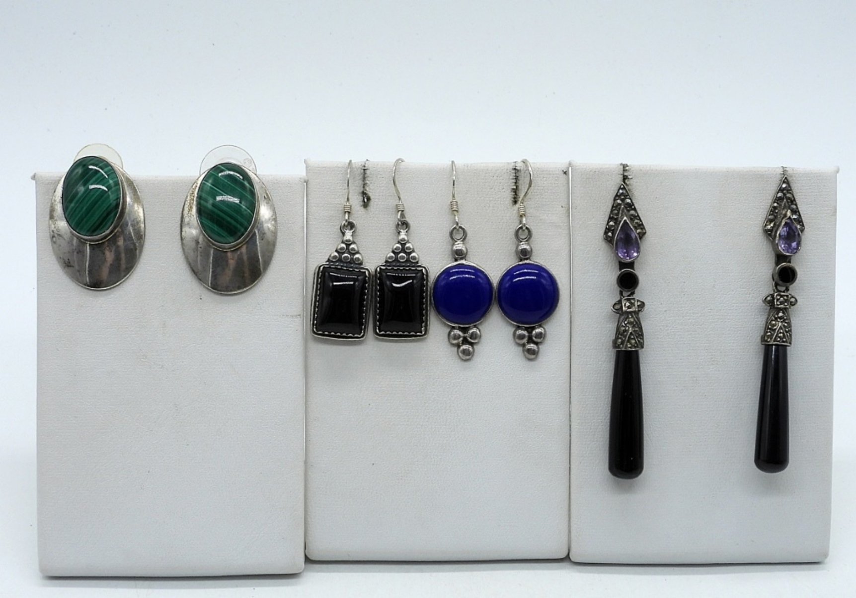 FOUR PAIR OF VINTAGE STERLING PIERCED EARRINGS. MALACHITE, BLACK ONYX, MARCASITE & SOMETHING BLUE. (19 DWT)