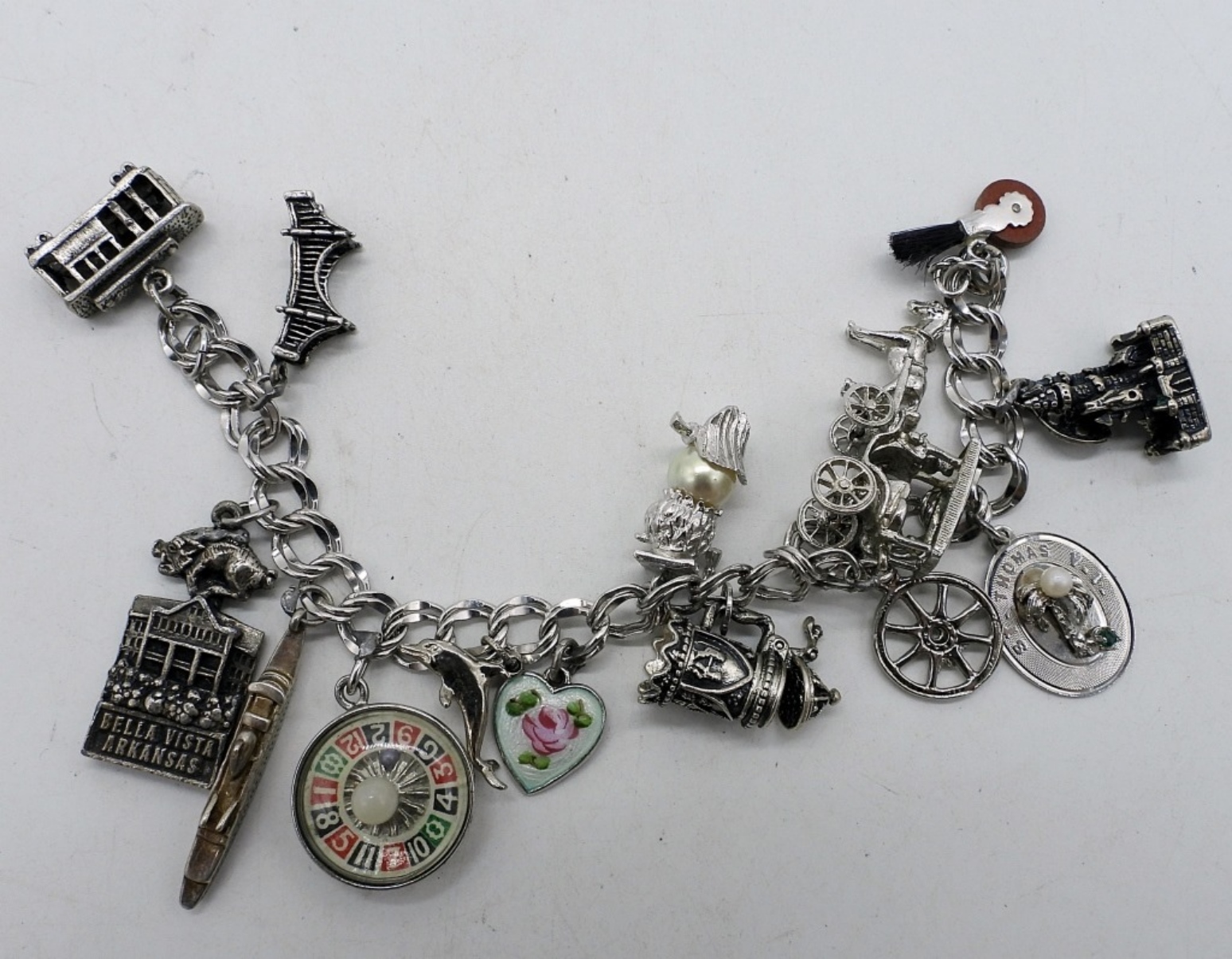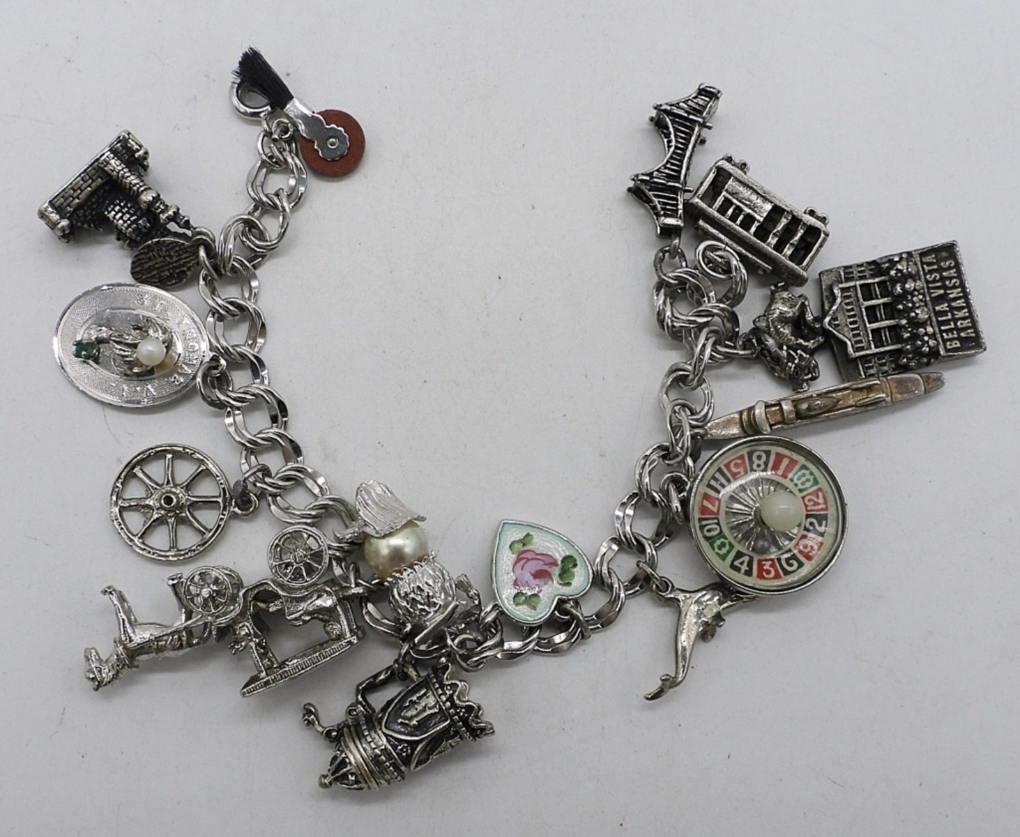 VINTAGE STERLING CHARM BRACELET WITH 14 CHARMS. SOME CHARMS MAY NOT BE STERLING, MAJORITY ARE MARKED 925. 7″ (40 DWT)