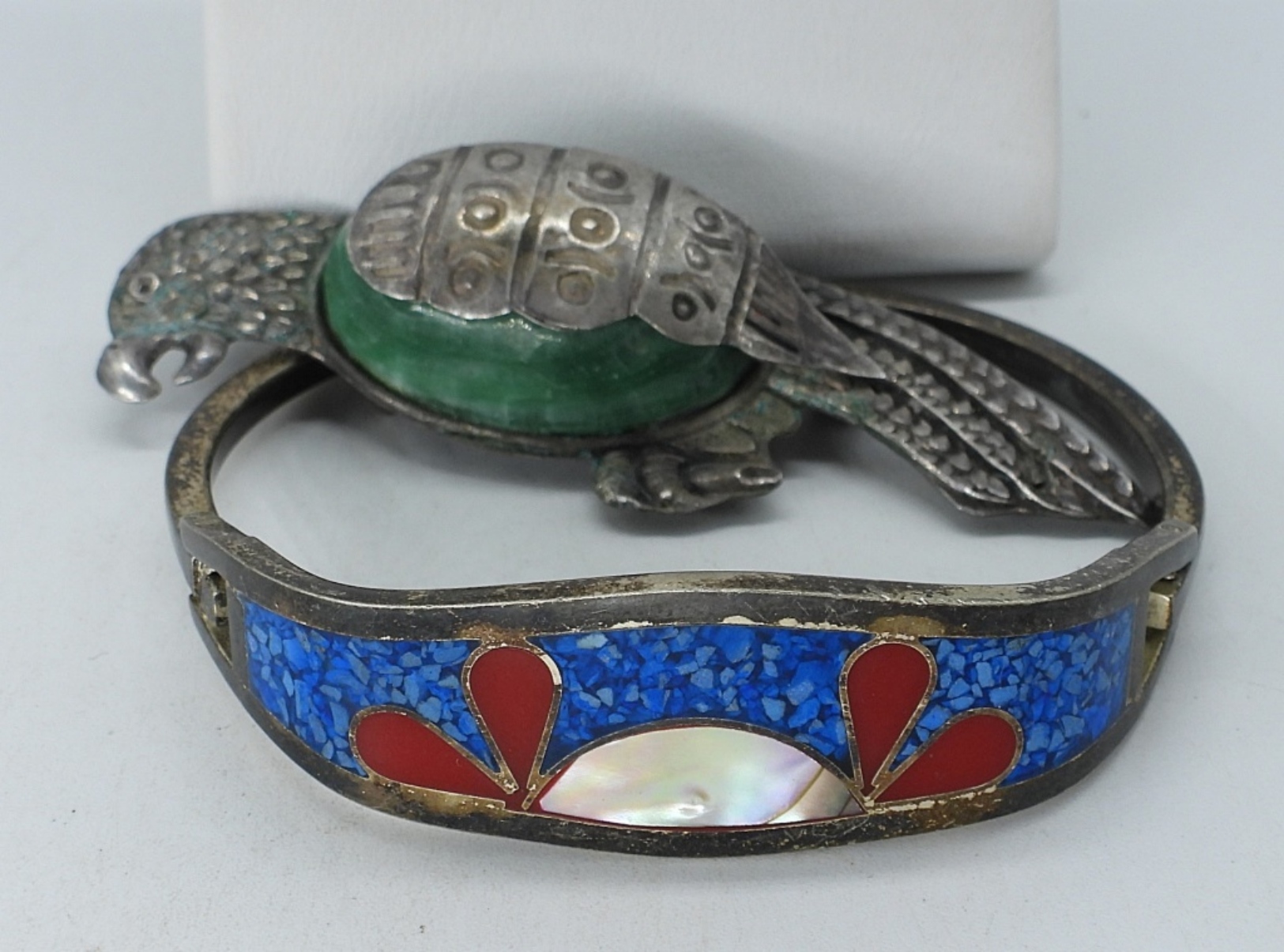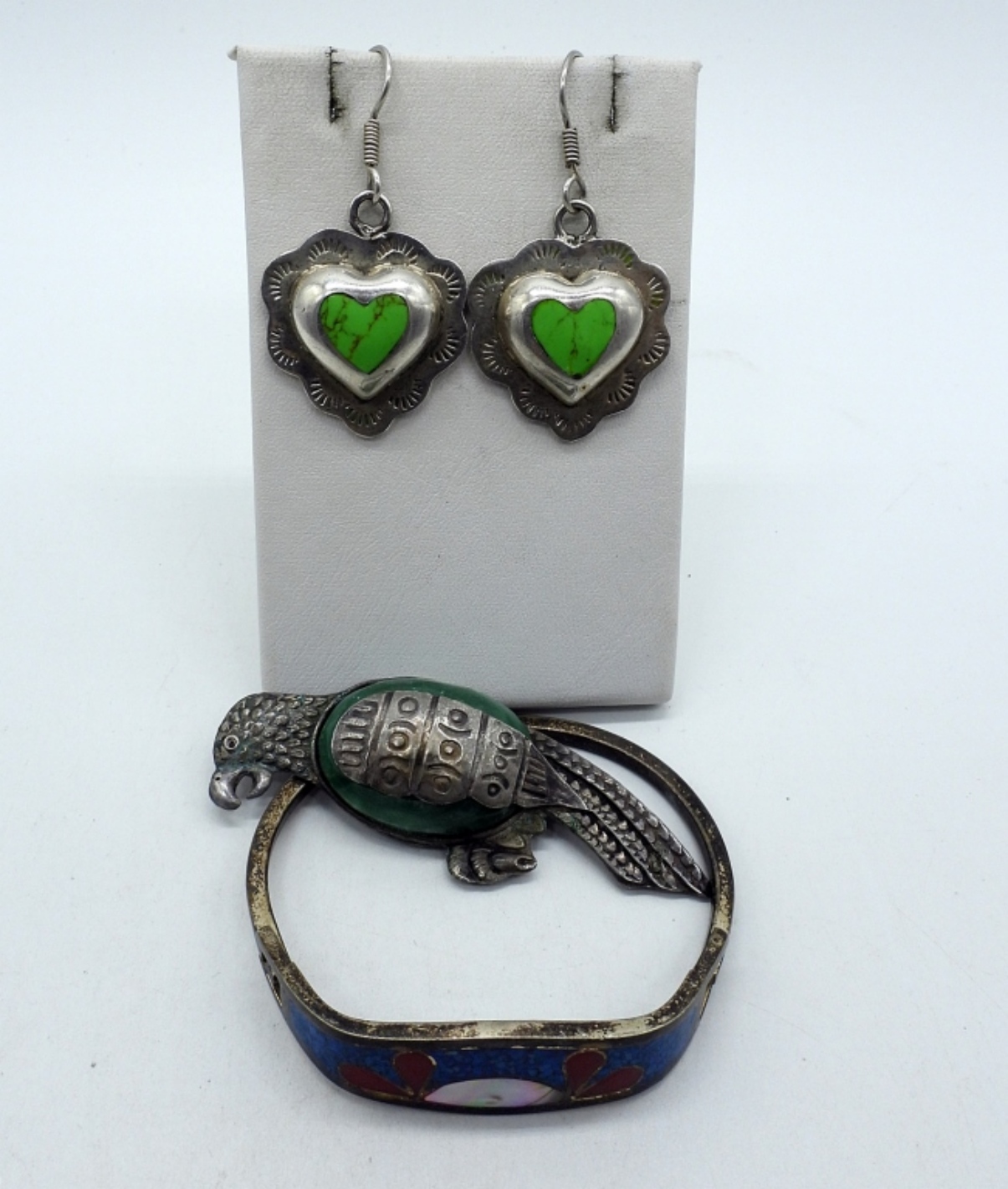 GREEN TURQUOISE, STERLING HEART SHAPED PIERCED EARRINGS (925 MEXICO). PARROT STERLING MALACHITE PIN, 3″. STERLING MEXICO GEMSTONE INLAY BRACELET. (31 DWT)