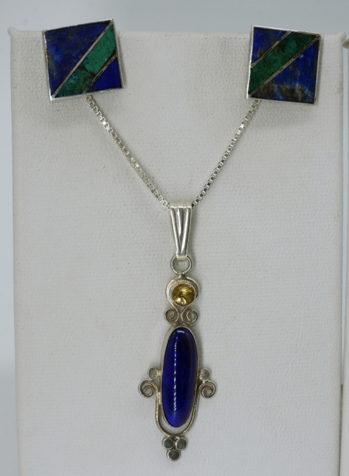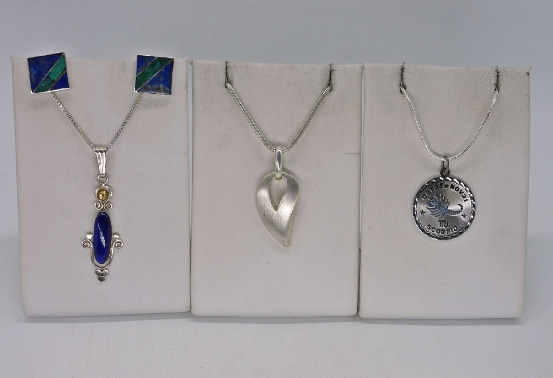 THREE STERLING FASHION NECKLACES, 18″ & 24″. ONE PAIR OF 950 SILVER INLAY PIERCED EARRINGS. (18.1 DWT)