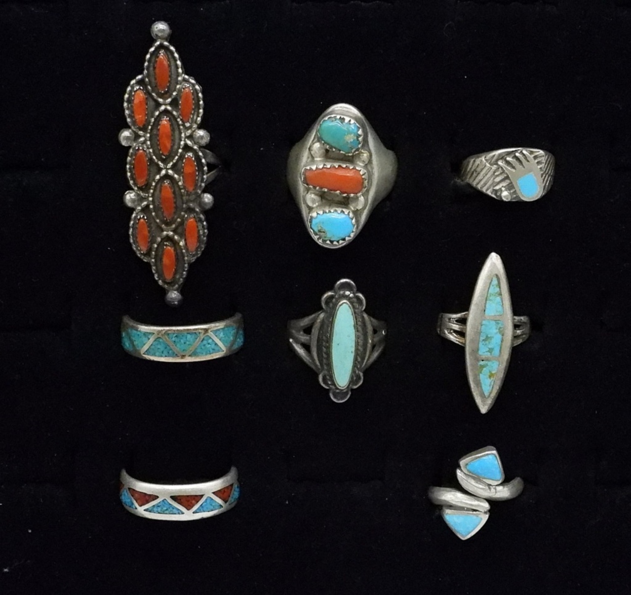 EIGHT VINTAGE STERLING TURQUOISE RINGS. SIZES 5 – 9 (30 DWT)