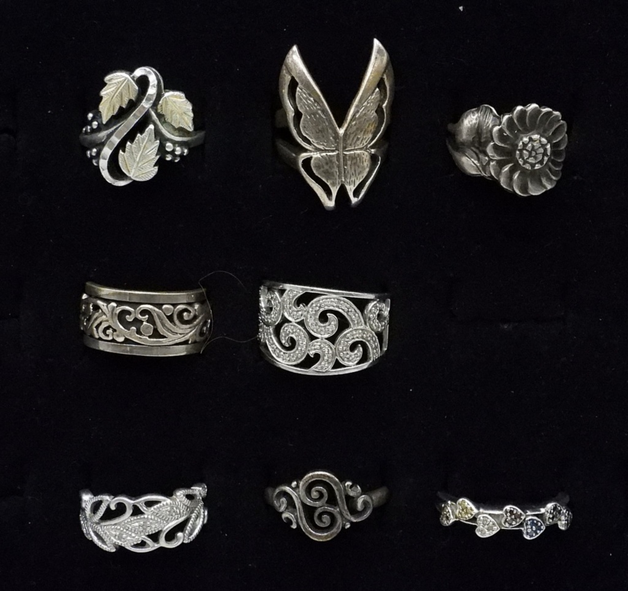 EIGHT STERLING LADIES FASHION RINGS / BANDS. SIZES 3 – 9 (24.5 DWT)