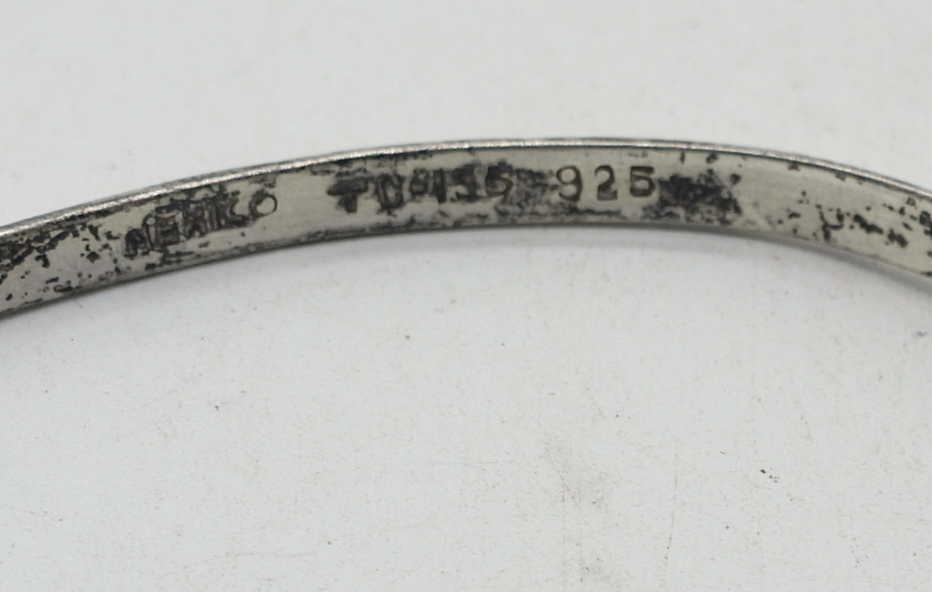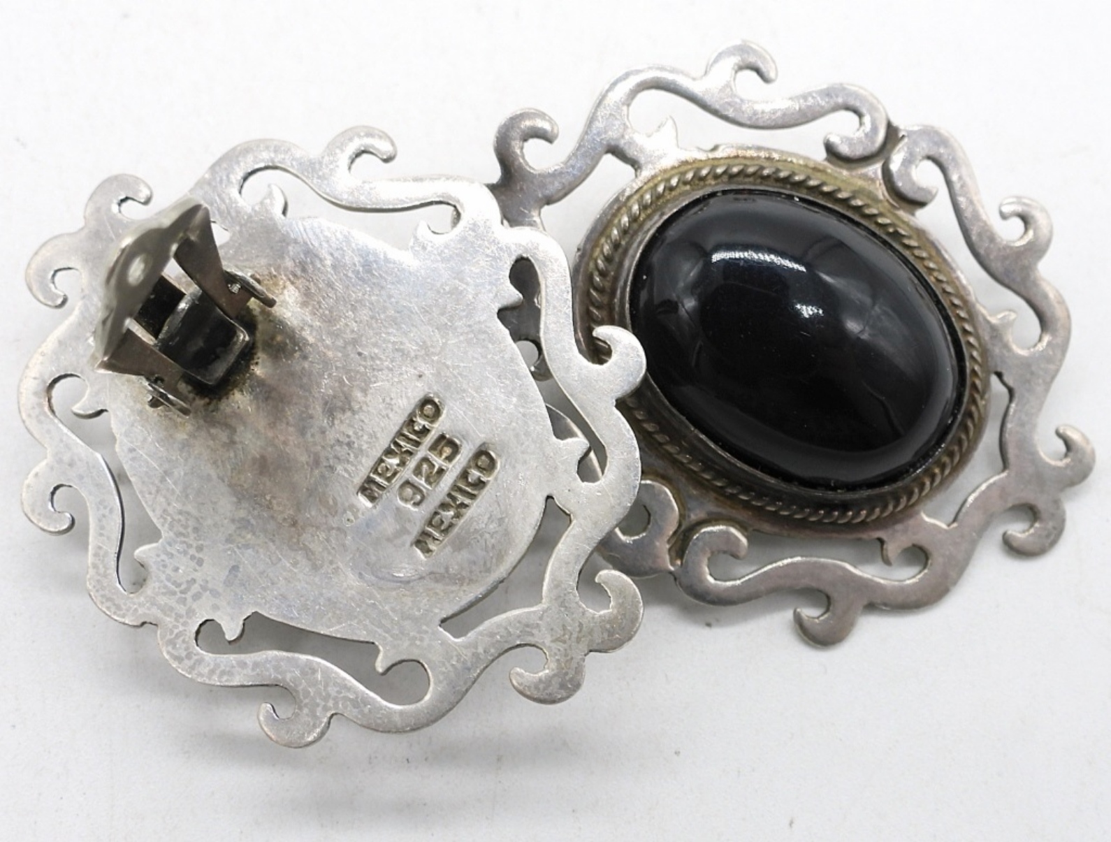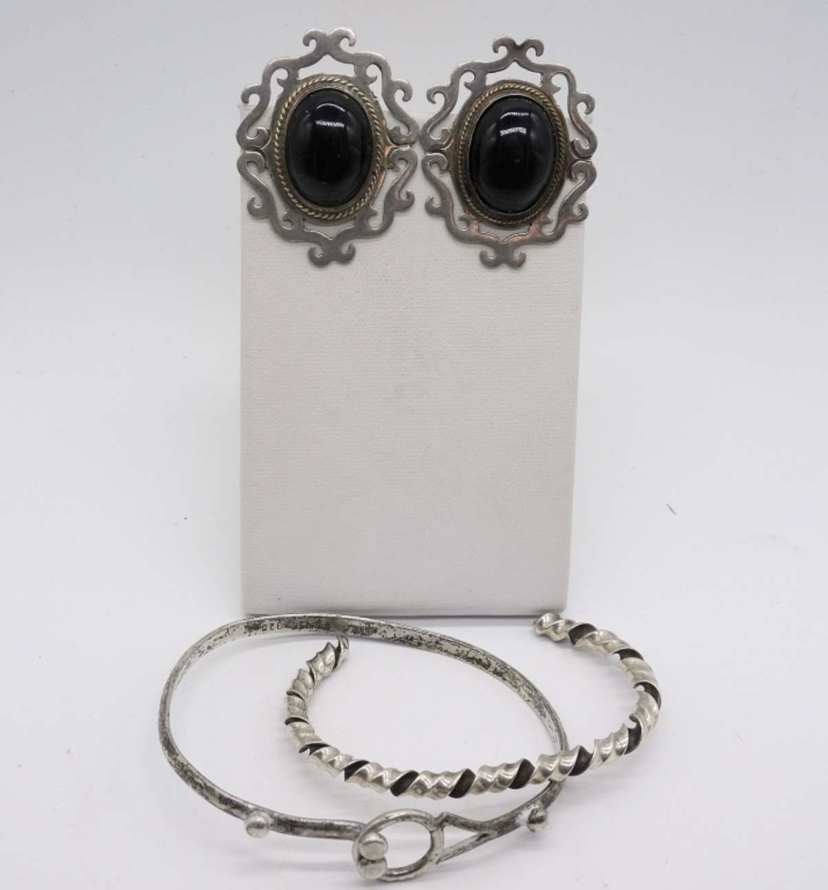 TAXCO STERLING BANGLE BRACELET, TC-155, 8″. MEXICO STERLING BLACK ONYX CLIP ON EARRINGS, 2″. 6″ CUFF BRACELET. (27 DWT)