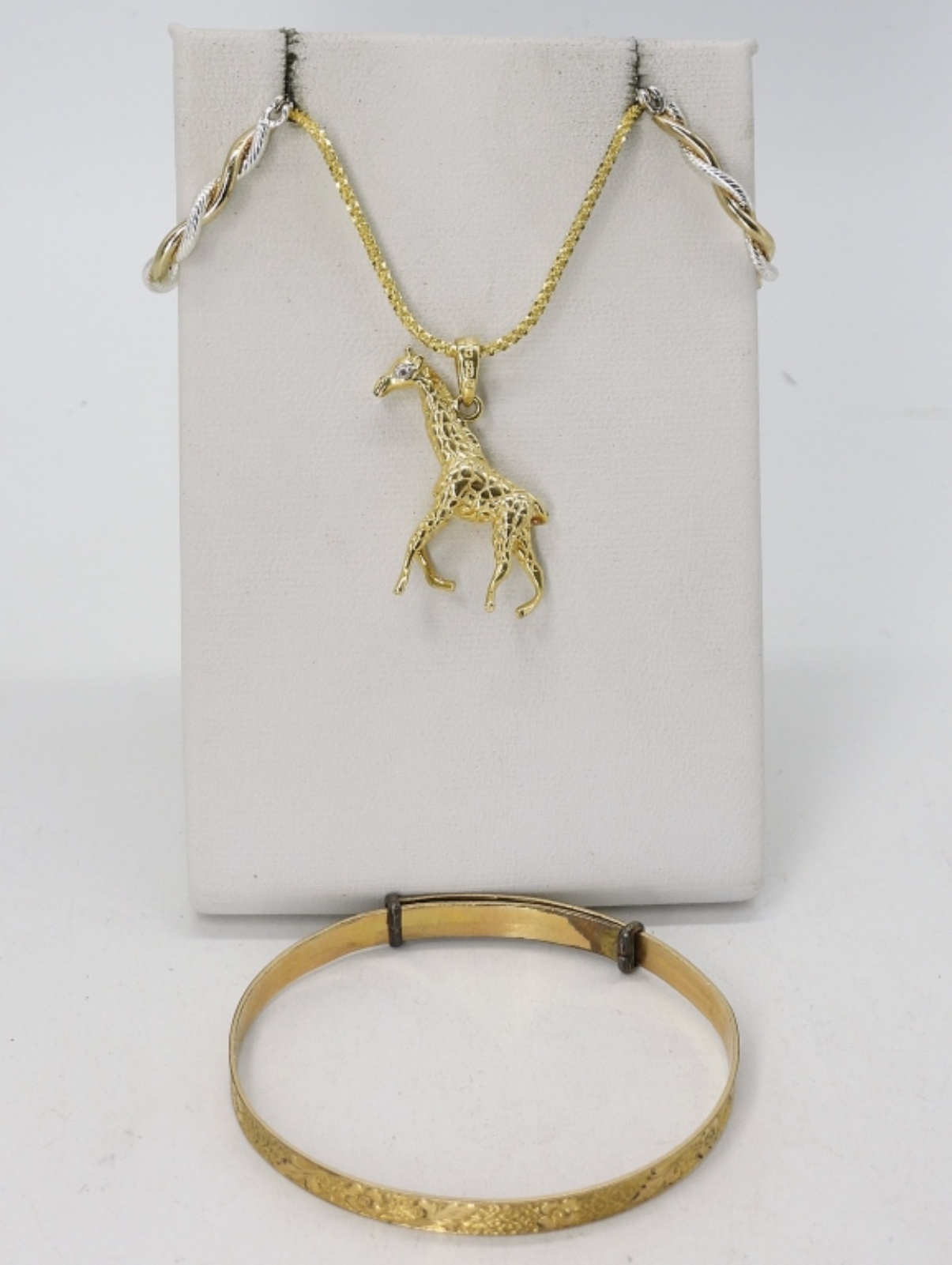 STERLING GOLD TONE GIRAFFE PENDANT ON A 18″ CHAIN. STERLING & GOLD TONE PIERCED HOOP EARRINGS. SMALL 1/20 12K GP OVER 925 BRACELET, ADJUSTABLE 6-7″. (8.7 DWT)
