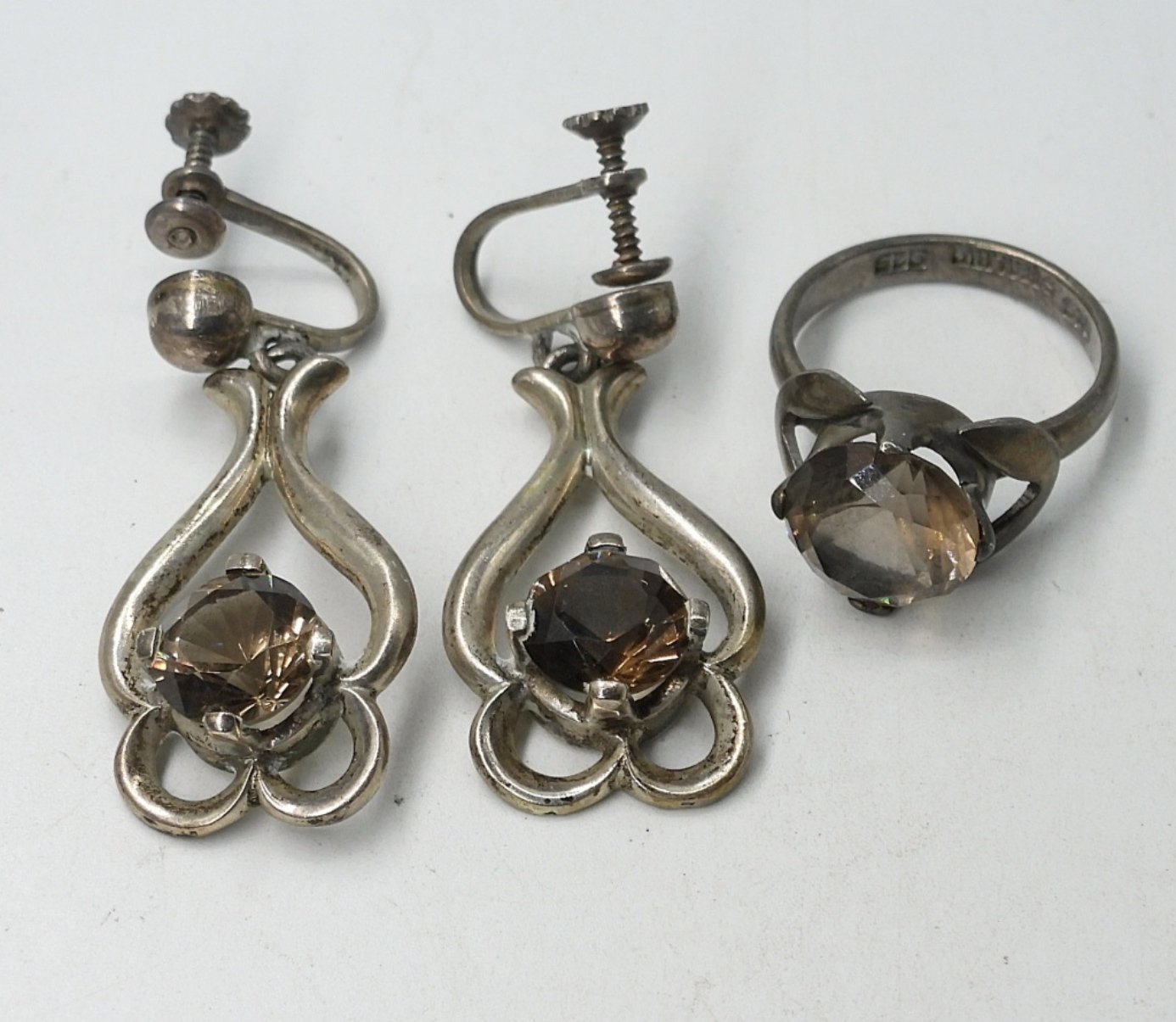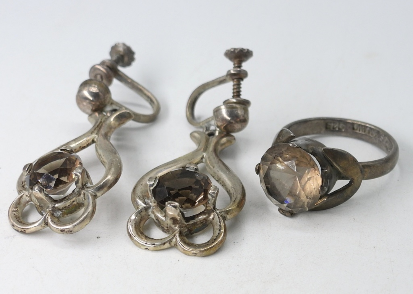 GORGEOUS VINTAGE STERLING SMOKEY QUARTZ SET. RING SIZE 7. SCREW BACK DANGLE EARRINGS, 2″ (10.6 DWT)