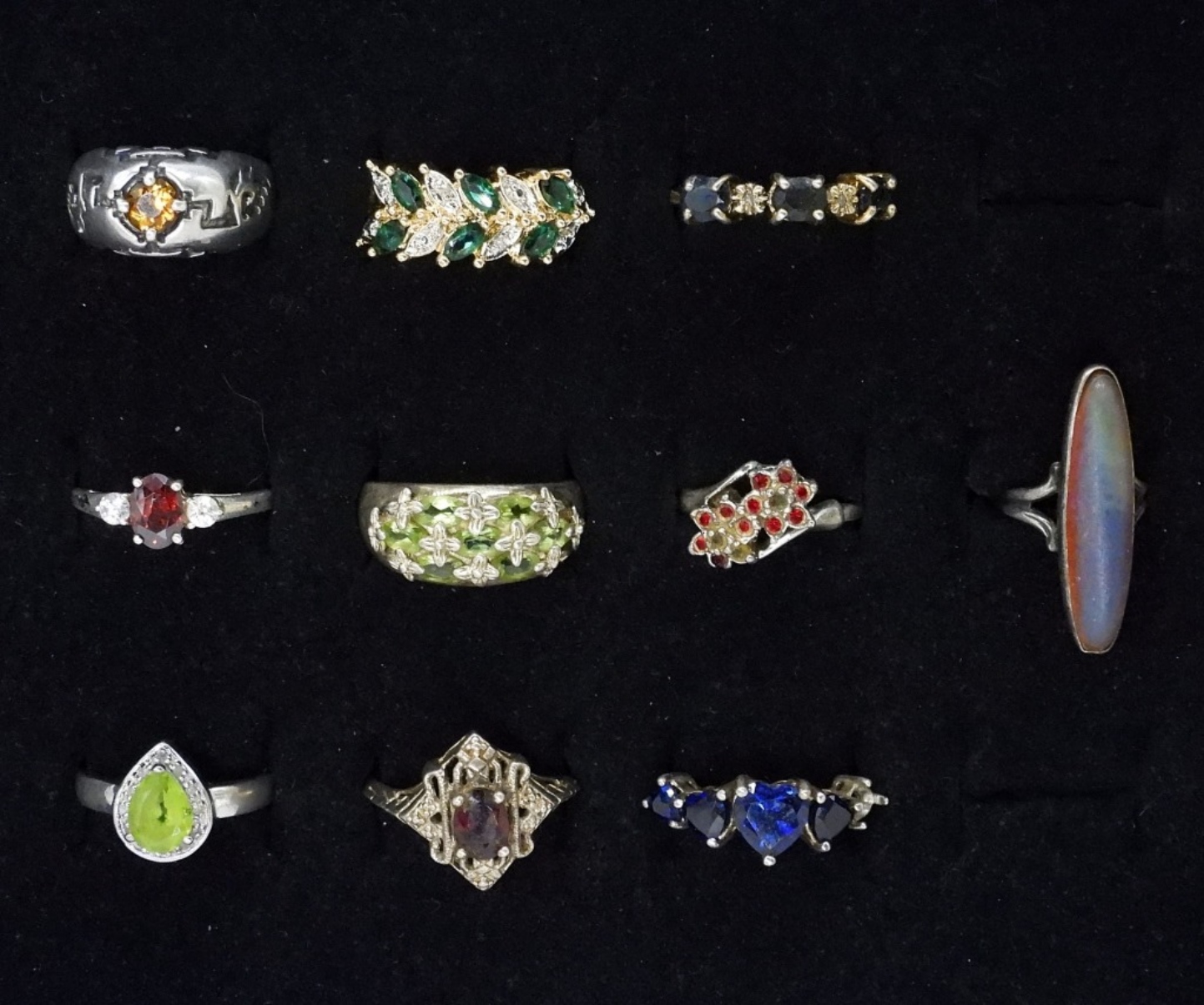TEN STERLING GEMSTONE FASHION RINGS. SIZES 3 – 8. PERIDOT, GARNET, FAUX SAPPHIRE & OTHER UNIDENTIFIED GEMSTONES. (23.5 DWT)