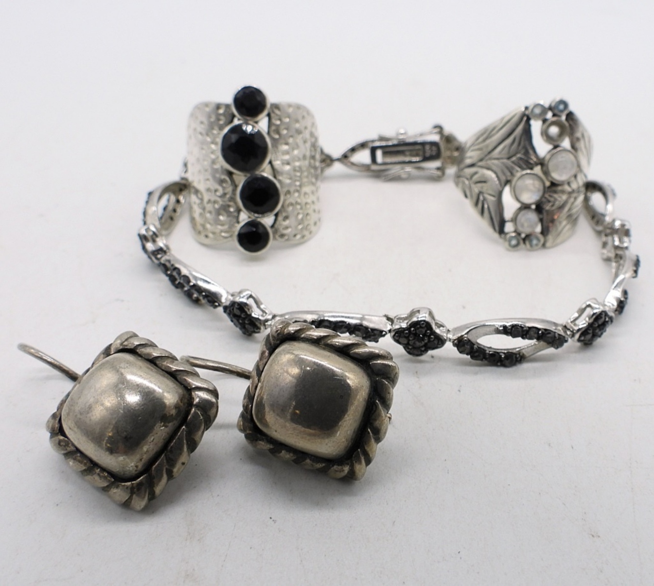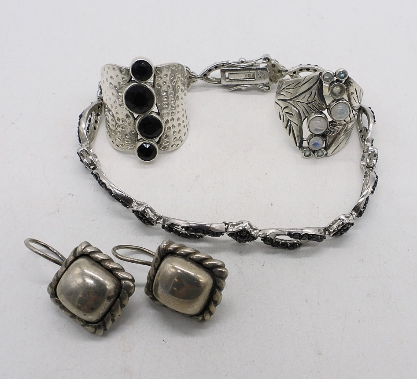 STERLING MOONSTONE (MISSING ONE STONE) AND BLACK ONYX WIDE BAND RINGS, SIZE 7 & 8. STERLING BLACK GEMSTONE BRACELET, 8″. STERLING PIERCED EARRINGS. (20 DWT)