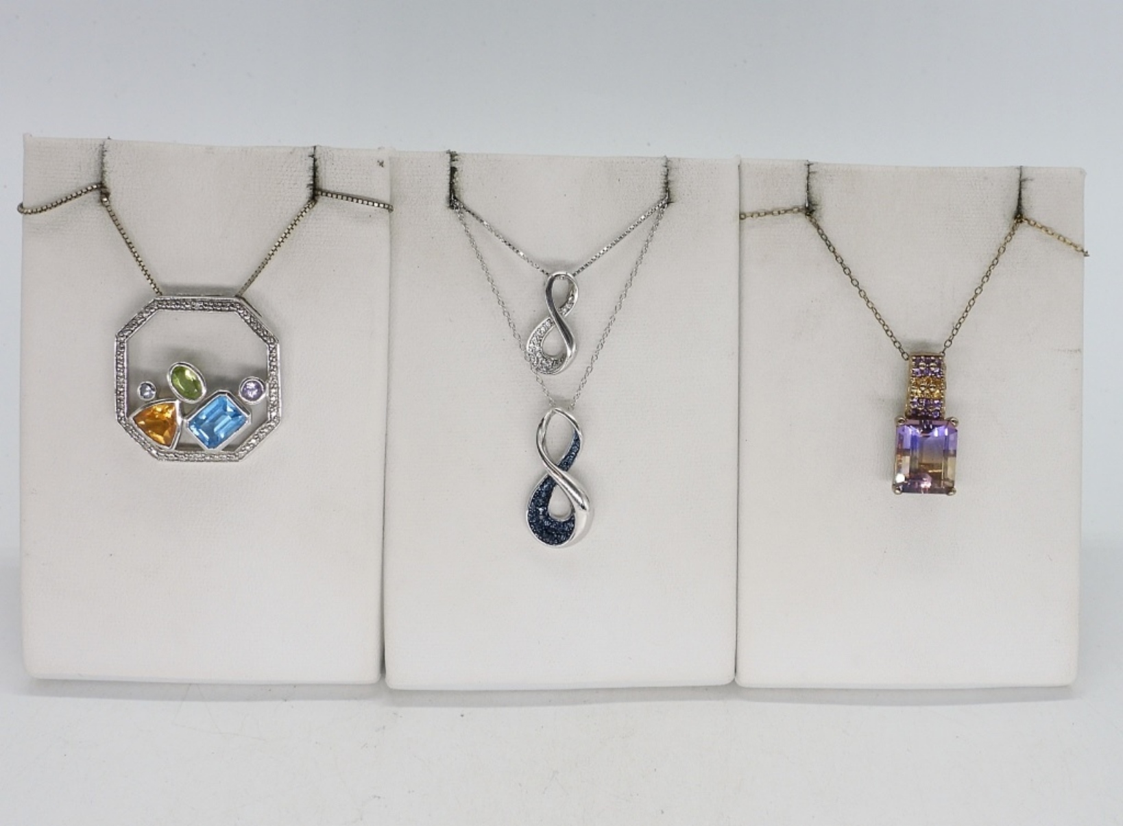 FOUR STERLING FASHION NECKLACES WITH GEMSTONES, ALL 18″ STERLING CHAINS. PERIDOT, AMETHYST, BLUE TOPAZ, CITRINE. (10.6 DWT)