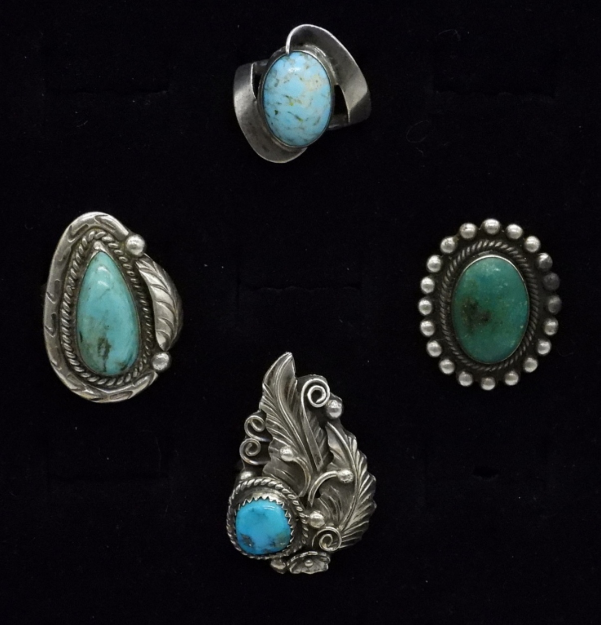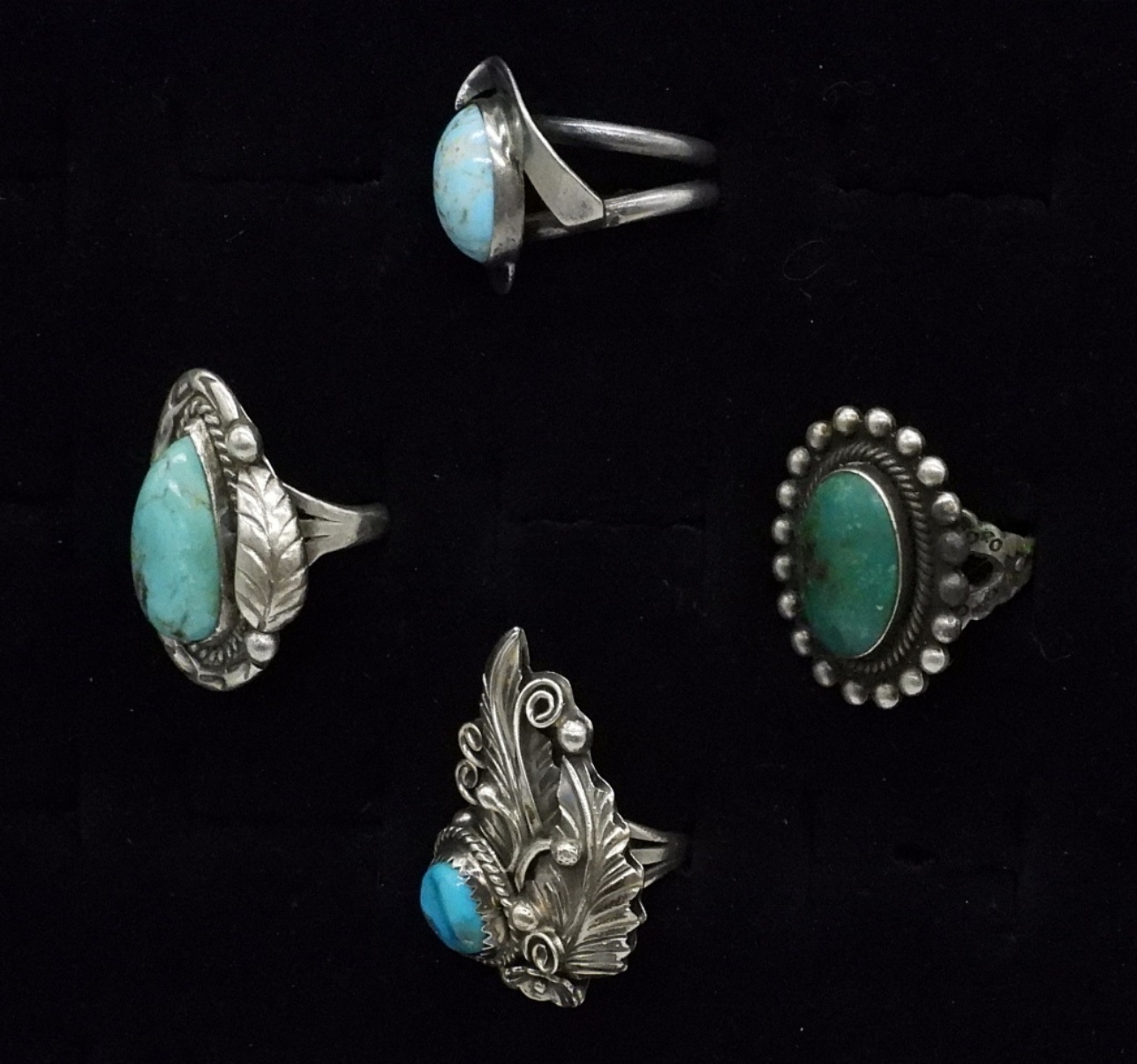FOUR VINTAGE STERLING RINGS ALL WITH TURQUOISE GEMSTONES. STUNNING! SIZES 5 – 7 (20 DWT)