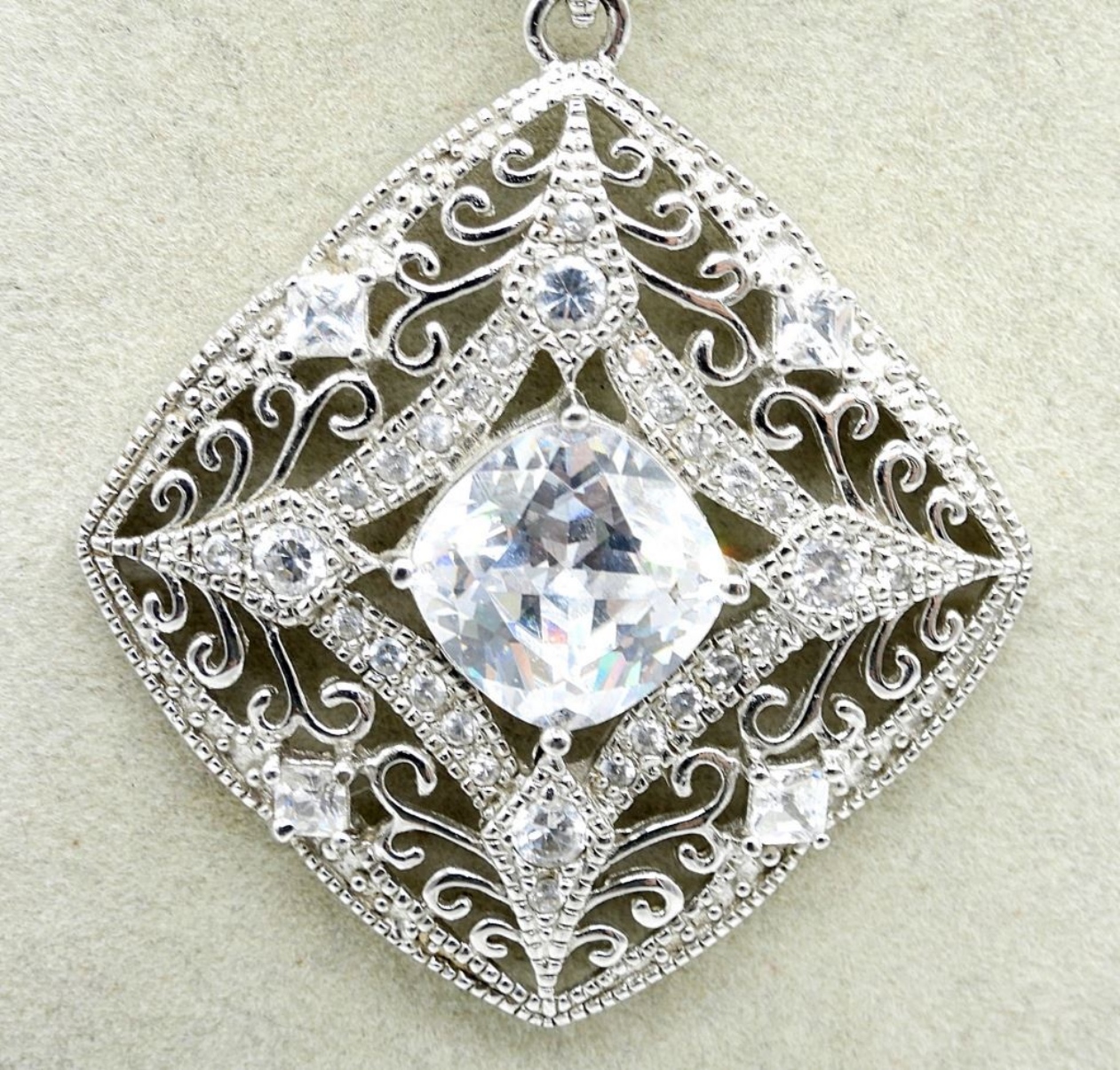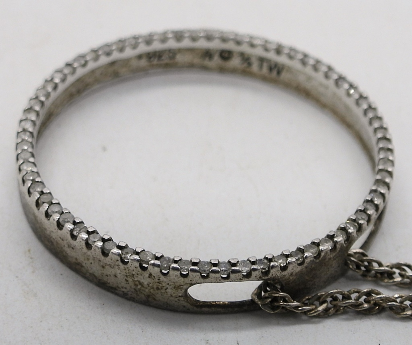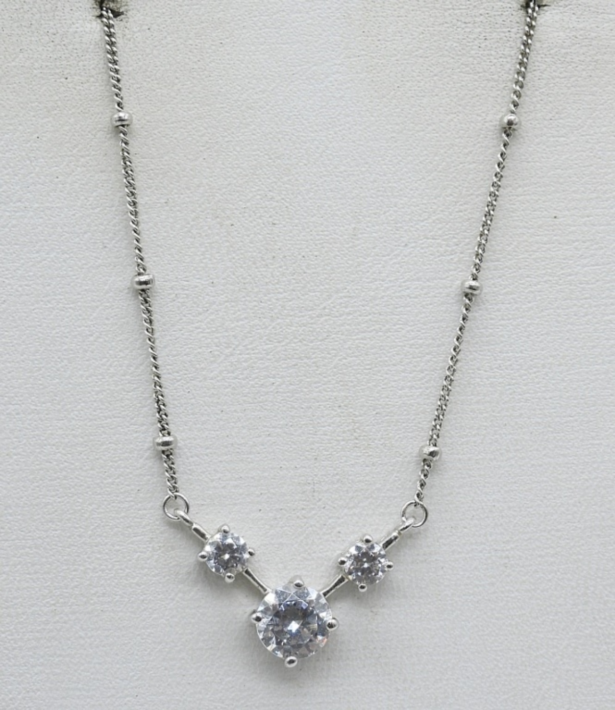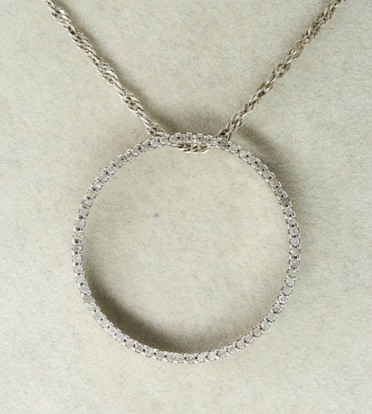 1/2 CARAT DIAMOND (SMALL DIAMONDS) CIRCLE PENDANT IN STERLING, ON A 18″ CHAIN. TWO STERLING SIMULATED DIAMOND NECKLACES, 16″ & 24″ CHAINS. (16.9 DWT)