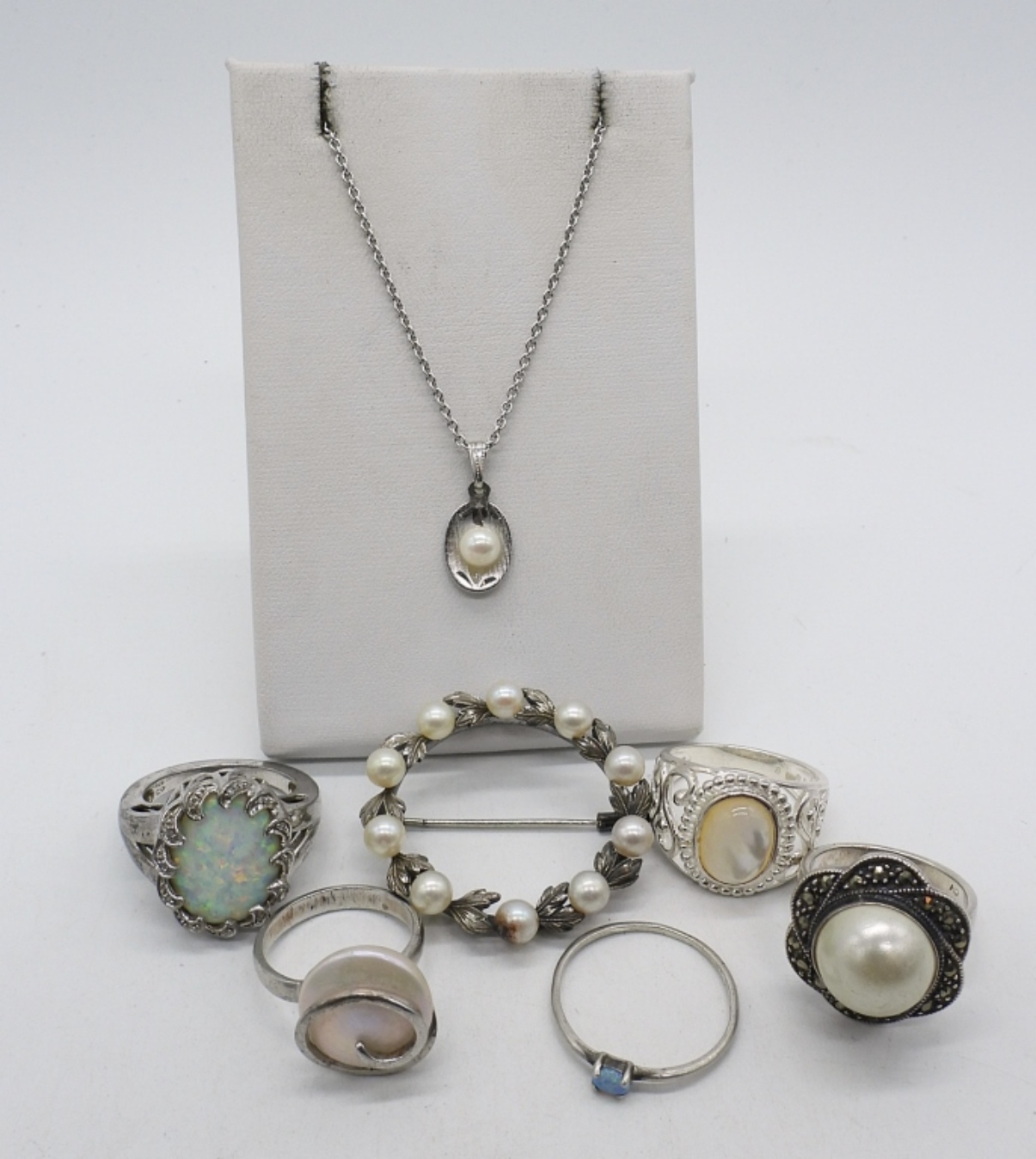 FIVE STERLING RINGS WITH PEARL, OPAL, MOTHER OF PEARL GEMSTONES. SIZES 6 – 8.5 . ONE VINTAGE STERLING PEARL BROOCH. STERLING PEARL NECKLACE, 16″. (21 DWT)