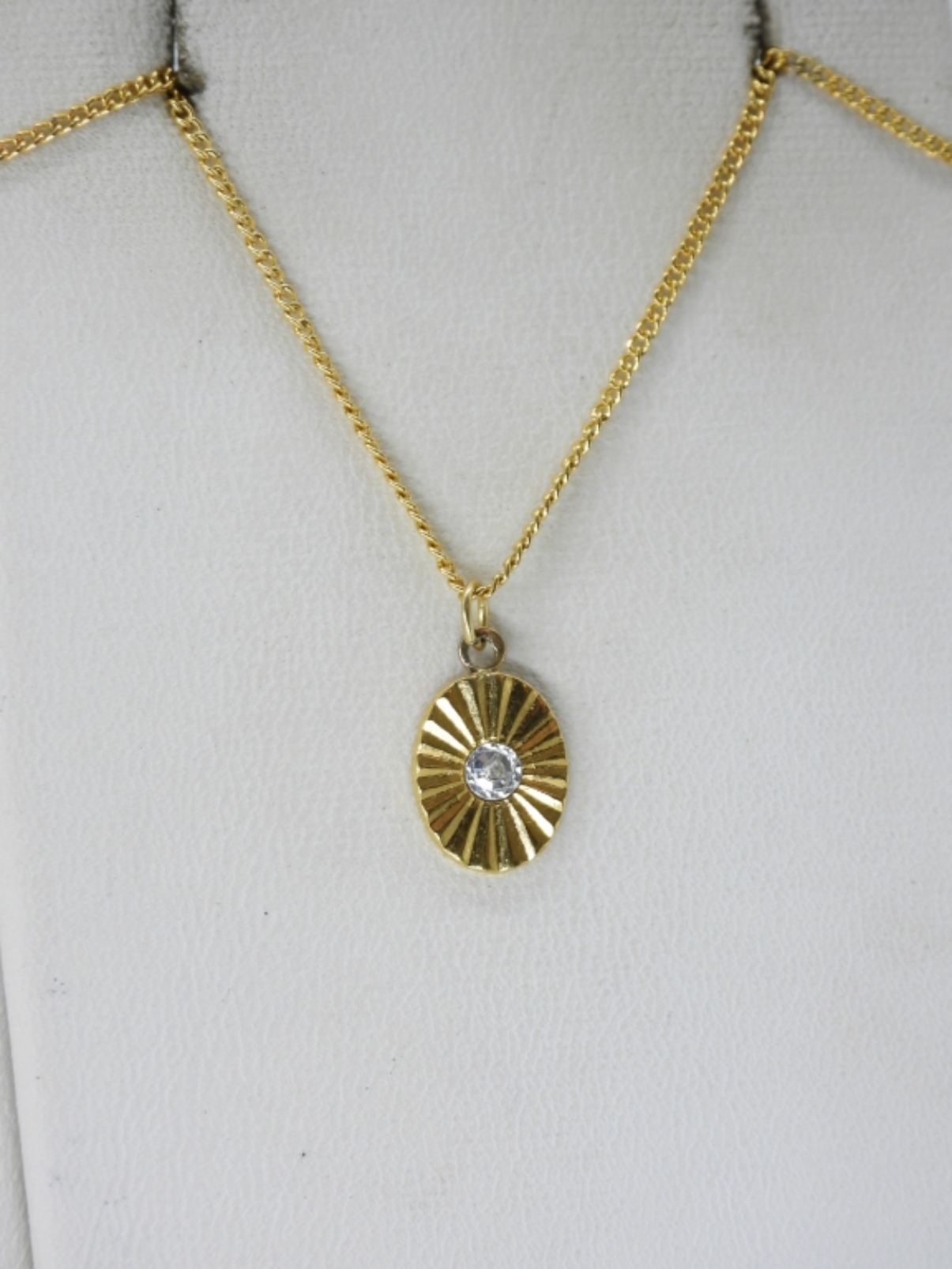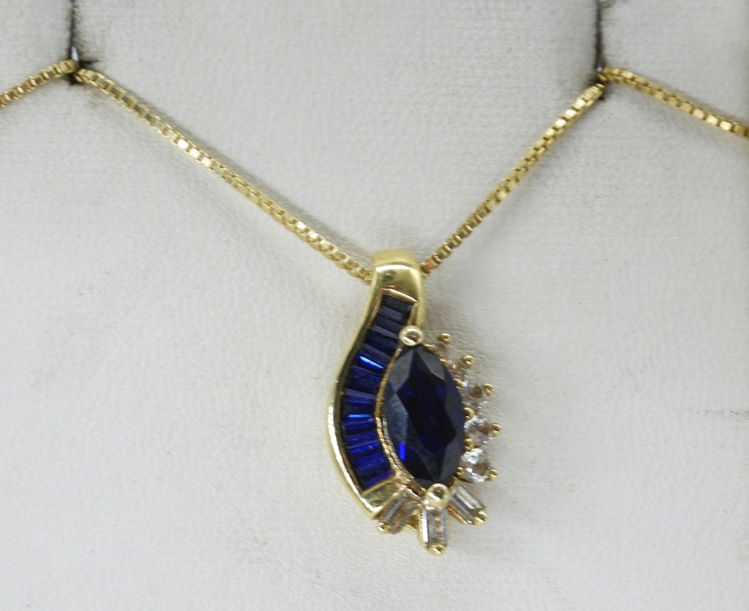 MOISSANITE STERLING GOLD TONE NECKLACE AND MATCHING RING, SIZE 7. GOLD TONE RING, STERLING WITH CLUSTER OF MOISSANITE GEMSTONES. STERLING GOLD TONE SIMULATED SAPPHIRE NECKLACE, 18″. (7.6 DWT)