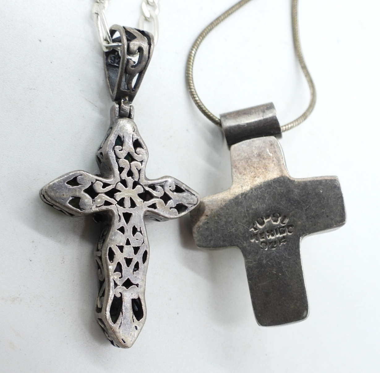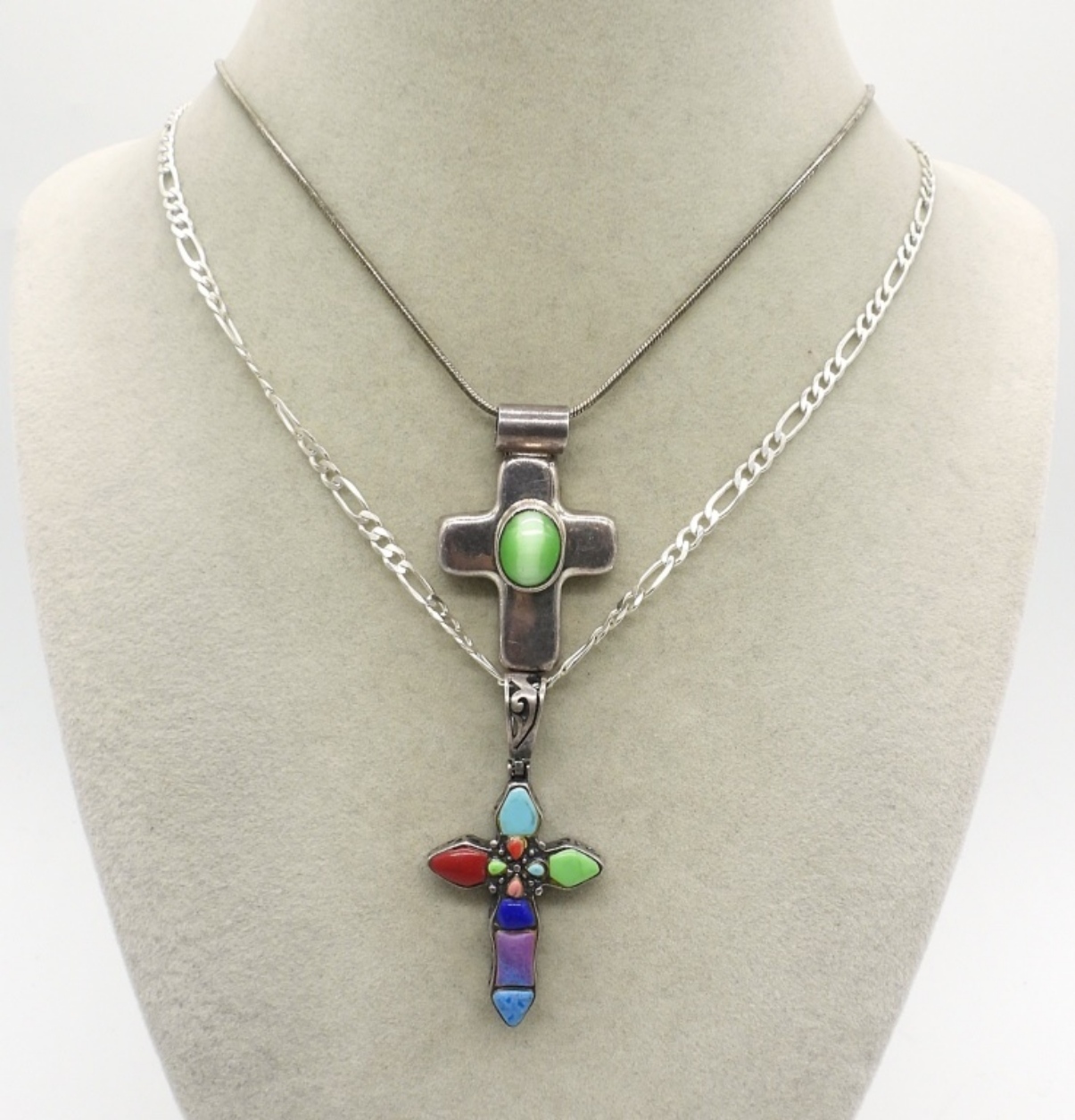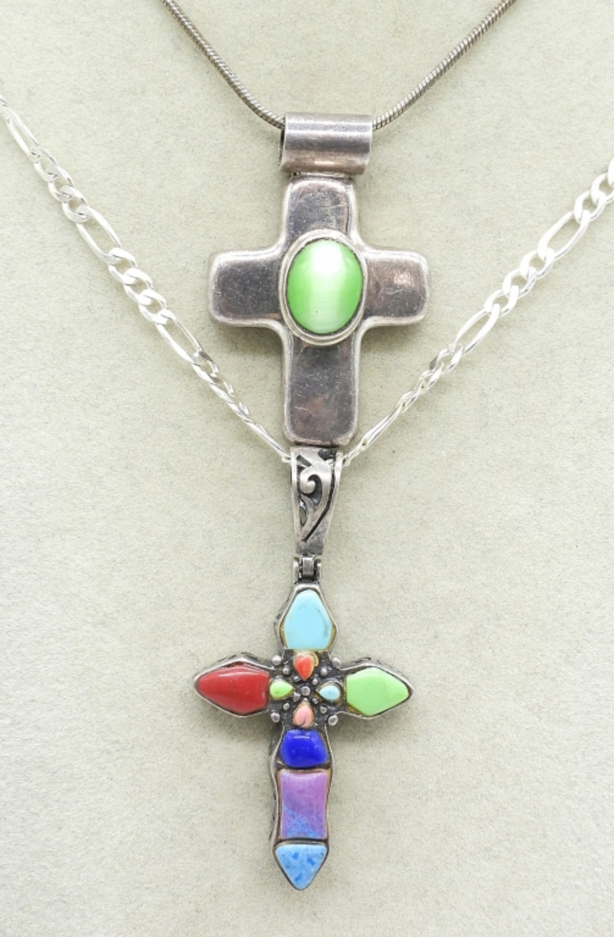 TWO STERLING VINTAGE, CROSS NECKLACES. GREEN CATS EYE & COLORED TURQUOISE INLAY. 18″ & 22″ CHAINS. (19 DWT)