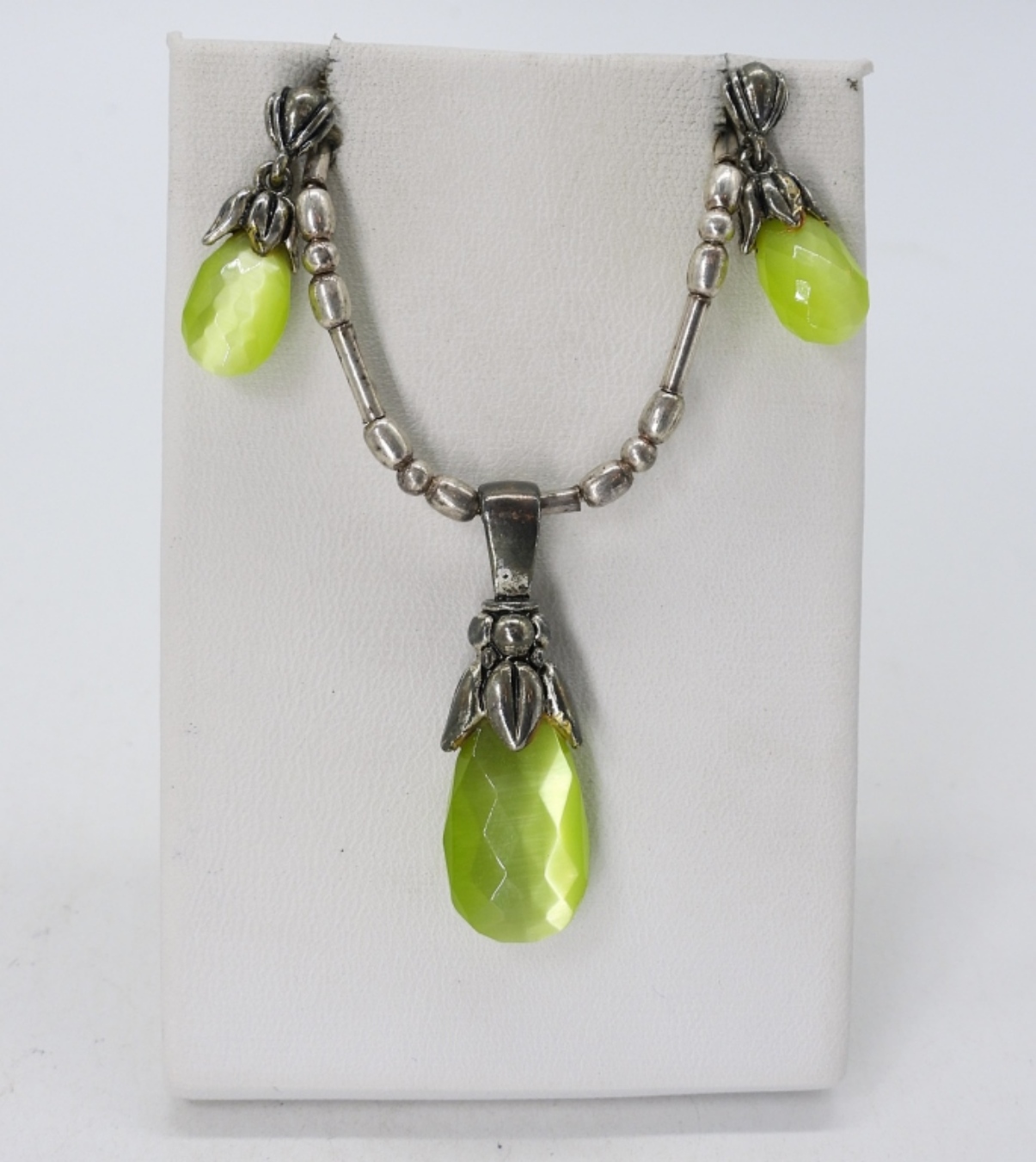 GREEN CATS EYE STERLING NECKLACE AND PIERCED EARRING SET. 18″ NECKLACE. (16 DWT)