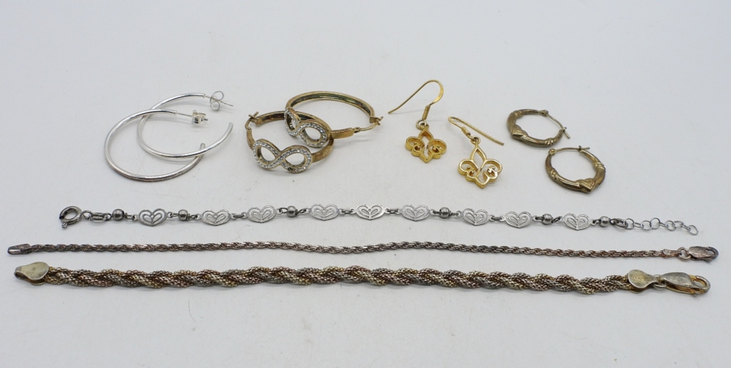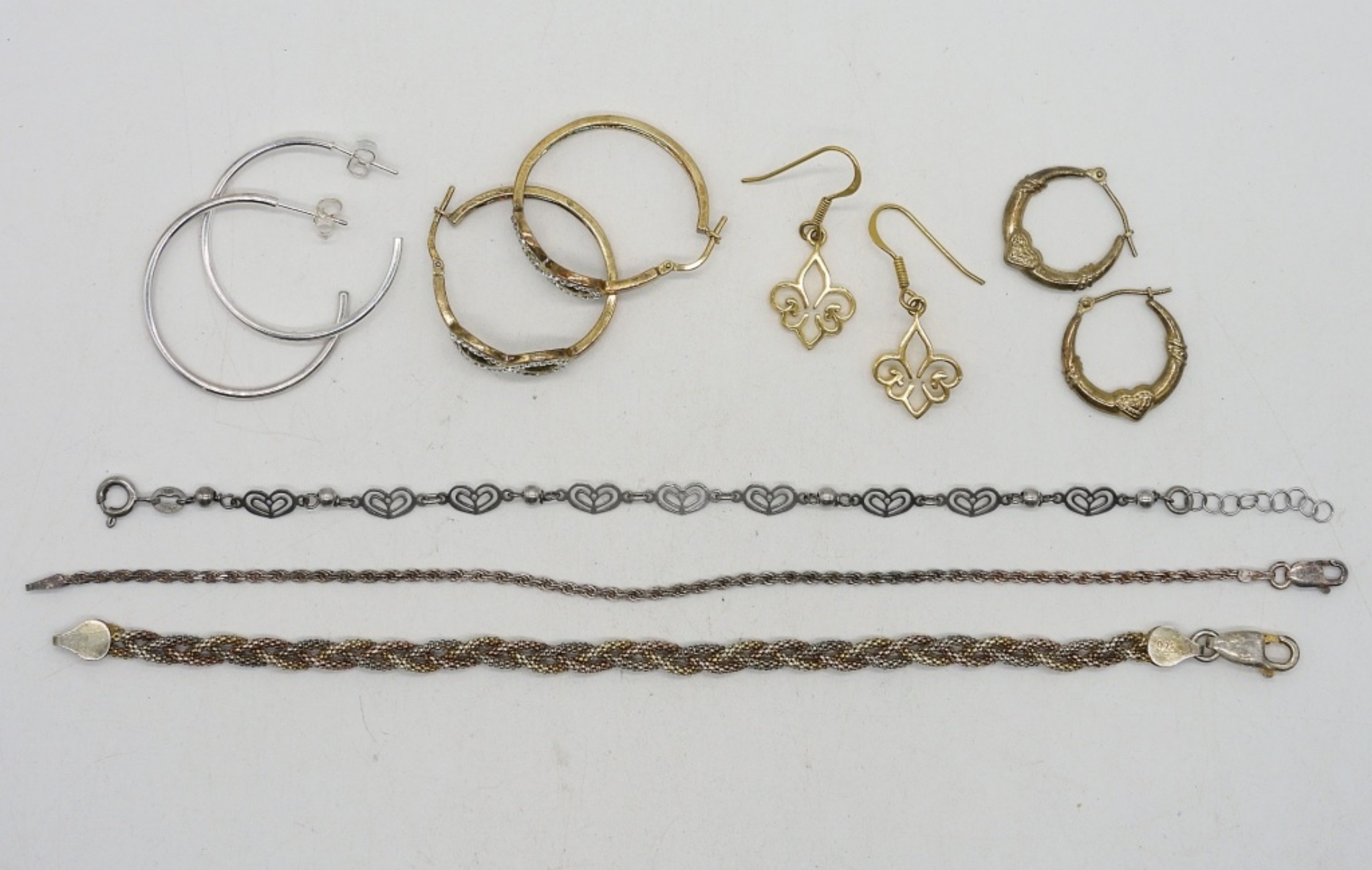 FOUR PAIR OF PIERCED STERLING / GOLD TONE EARRINGS. THREE STERLING BRACELETS 7 – 8″. (13.3 DWT)