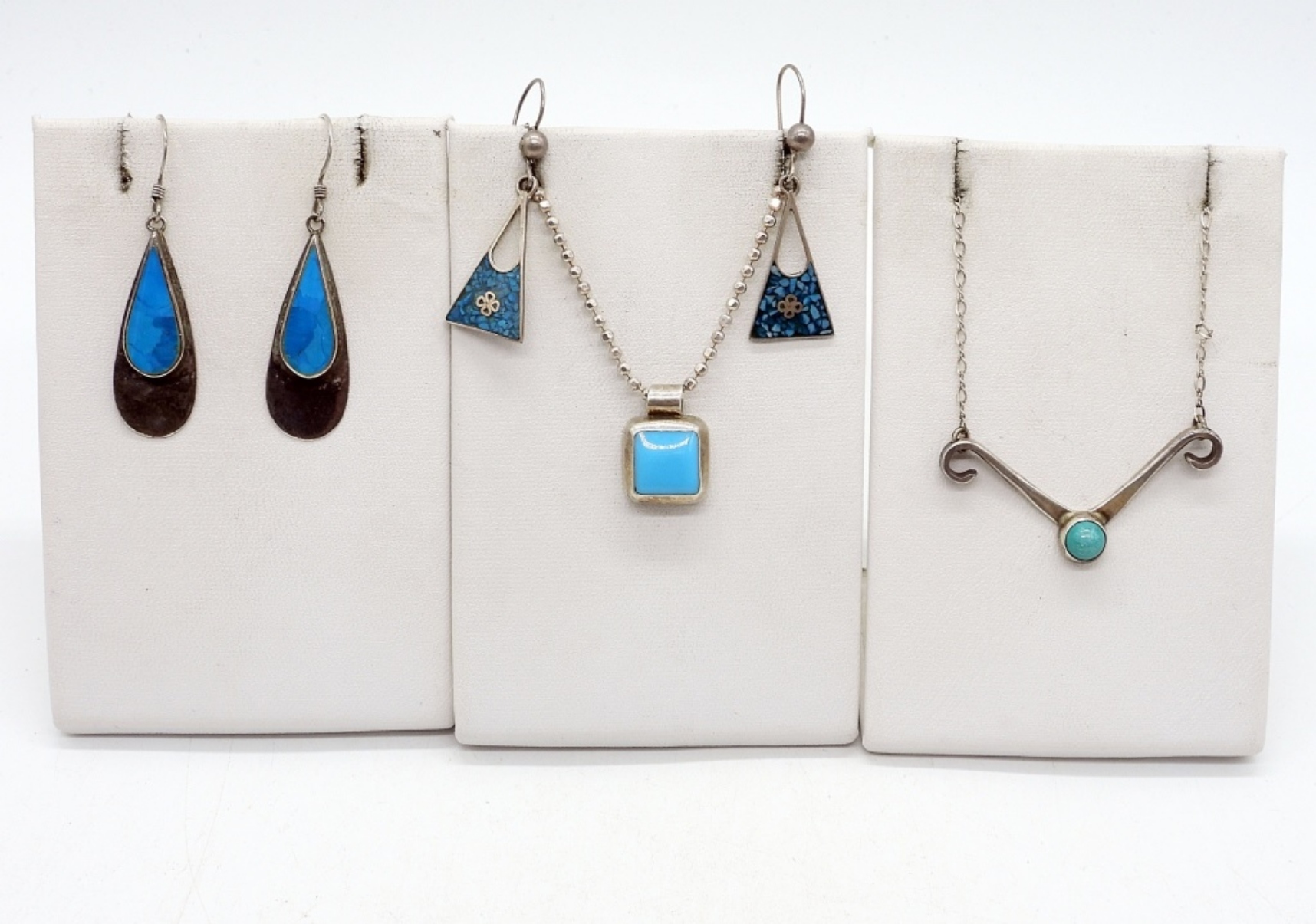 TWO STERLING TURQUOISE NECKLACES, 14″ & 18″. TWO PAIR OF PIERCED TURQUOISE EARRINGS. (12.2 DWT)