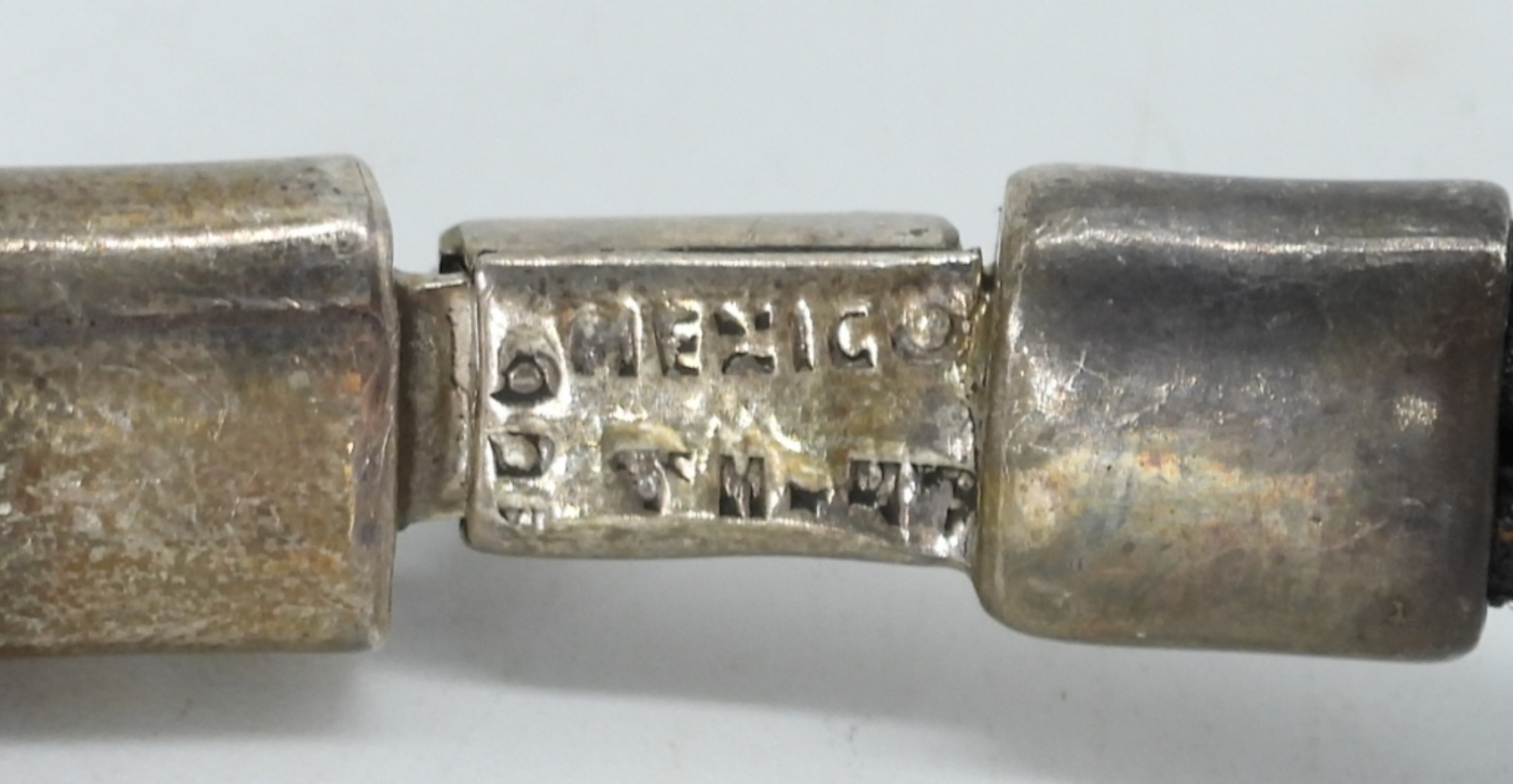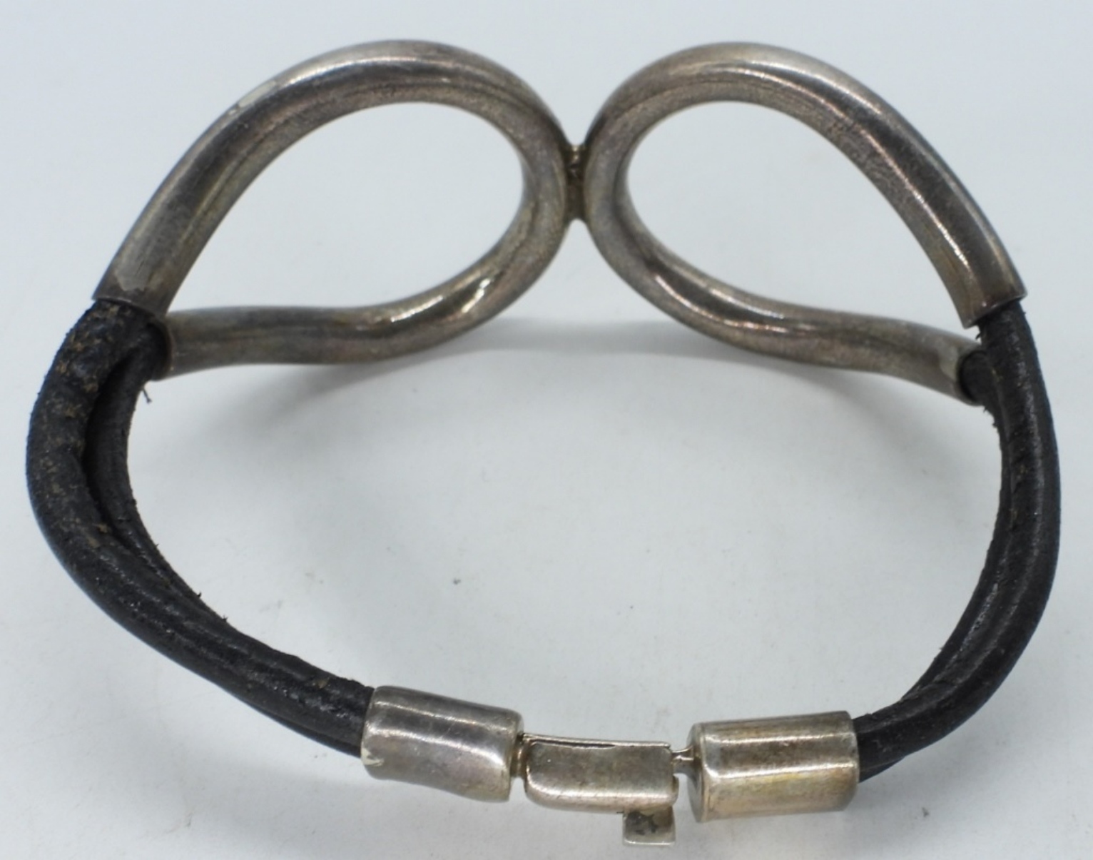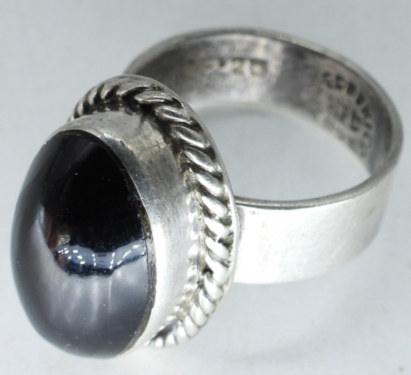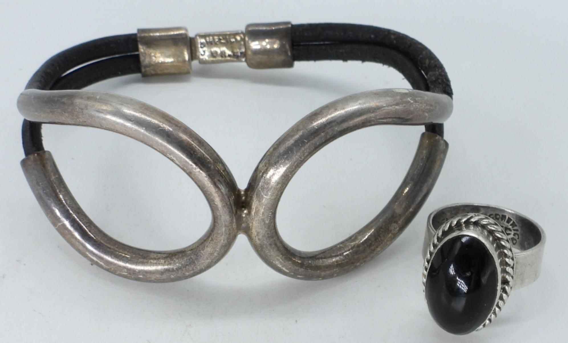 STERLING & LEATHER TAXCO BRACELET (TM-47) 8″. STERLING BLACK ONYX RING, SIZE 6.5, MARKED TF-28 (19 DWT)
