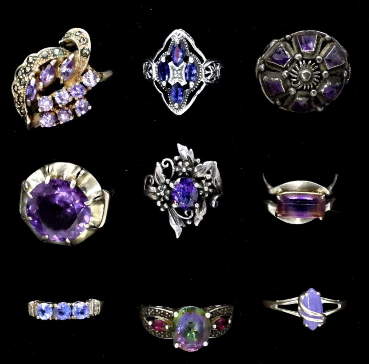 NINE STERLING RINGS WITH AMETHYST, MARCASITE & MYSTIC TOPAZ GEMSTONES. GENUINE & SIMULATED. SIZES 5.5 – 10 (30 DWT)