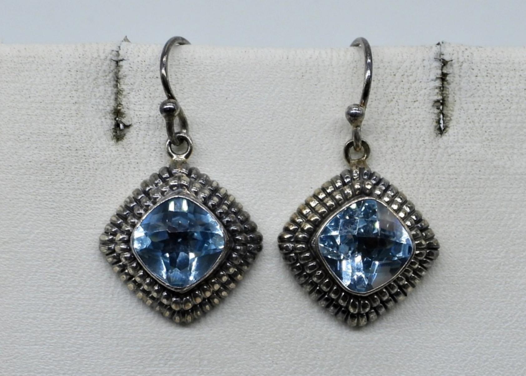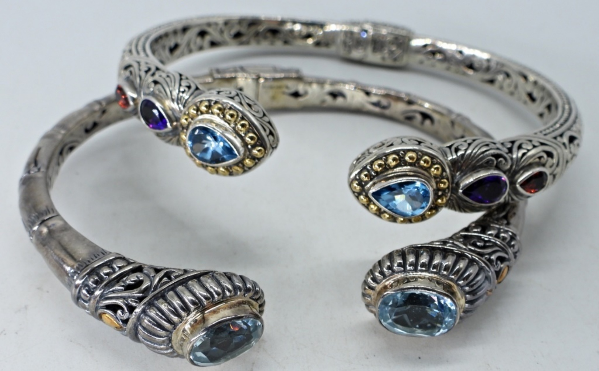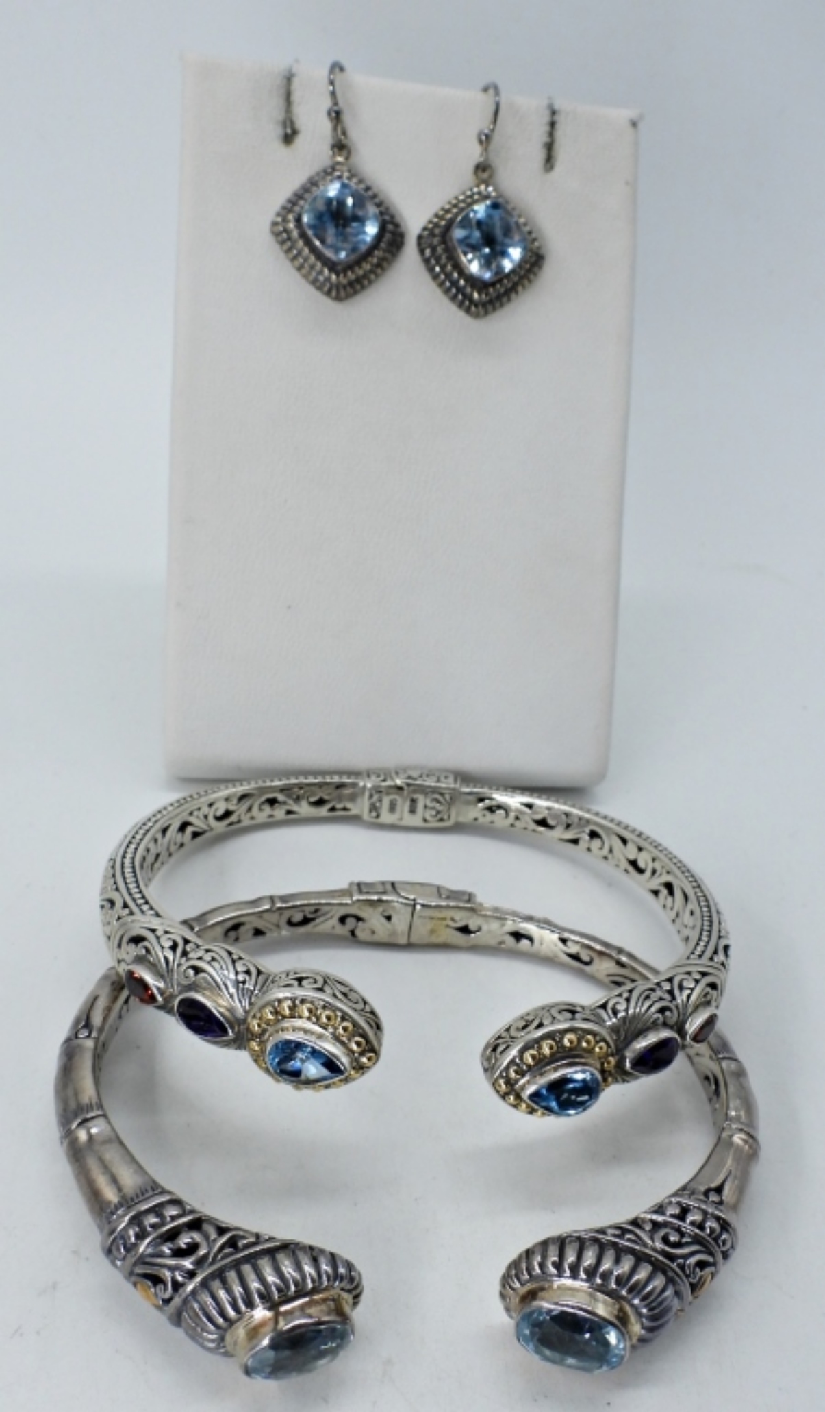 TWO STERLING SILVER BRACELETS WITH 18K YG ACCENTS. BLUE TOPAZ, AMETHYST & GARNET GEMSTONES. 8″. BLUE TOPAZ STERLING PIERCED EARRINGS. (34 DWT)