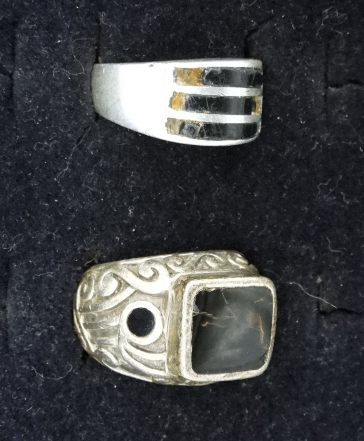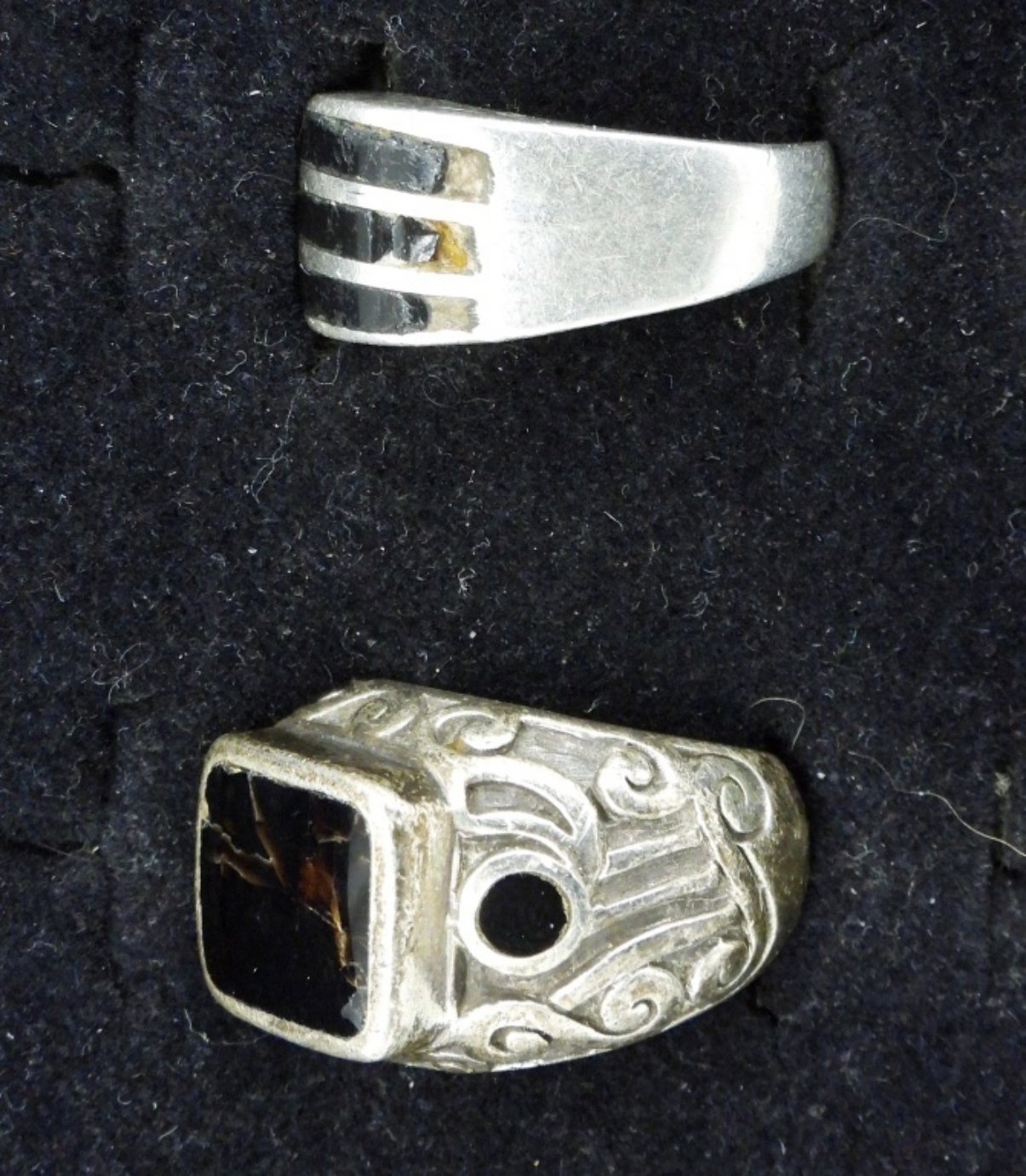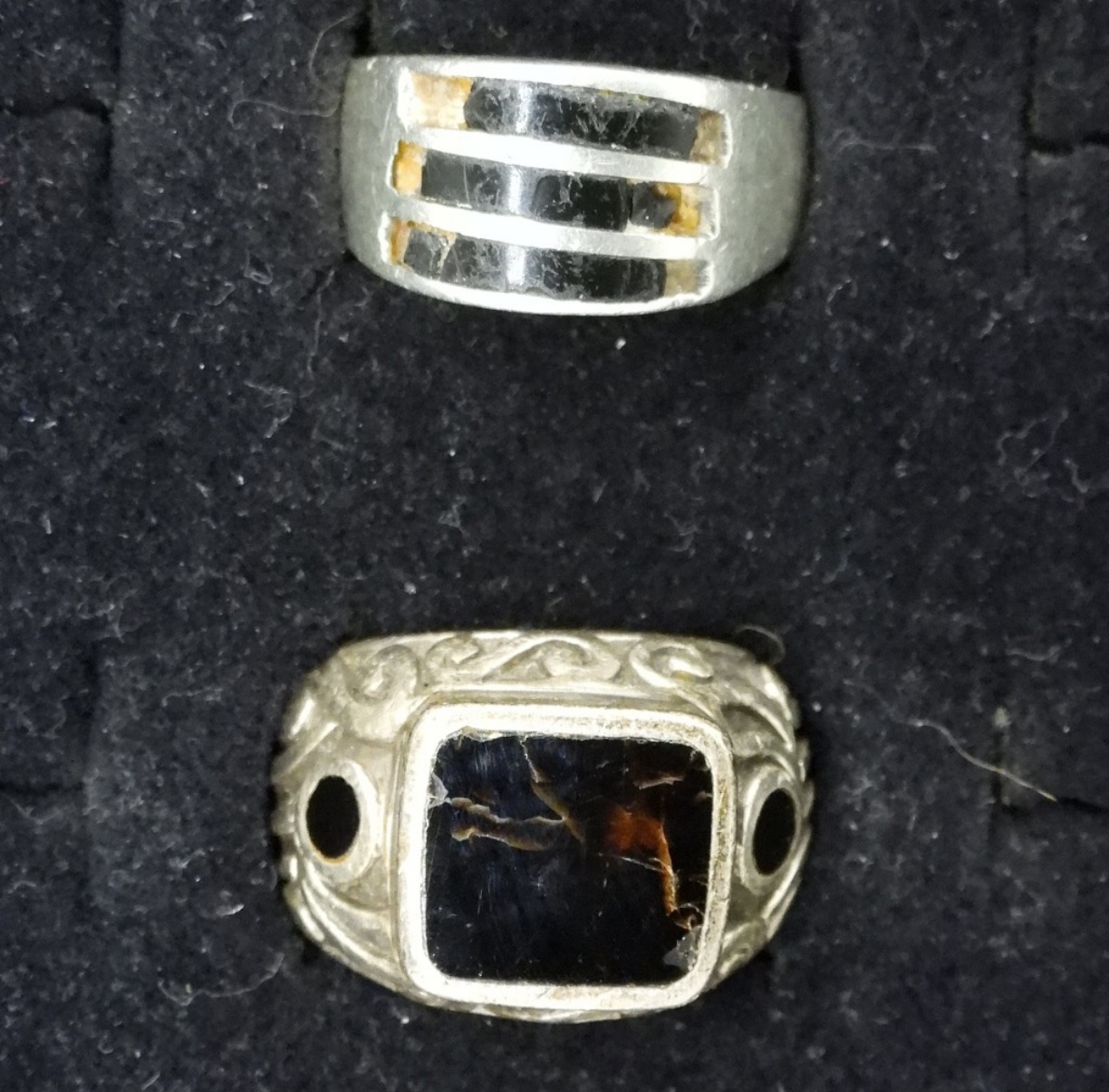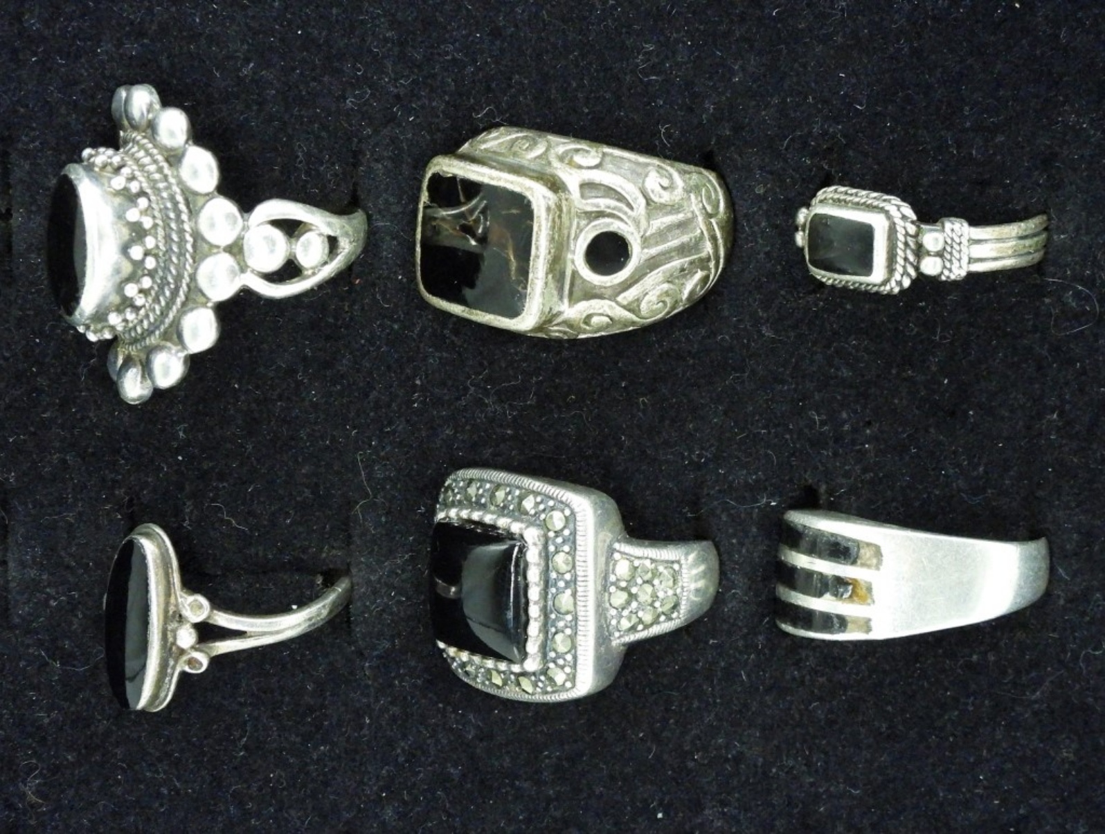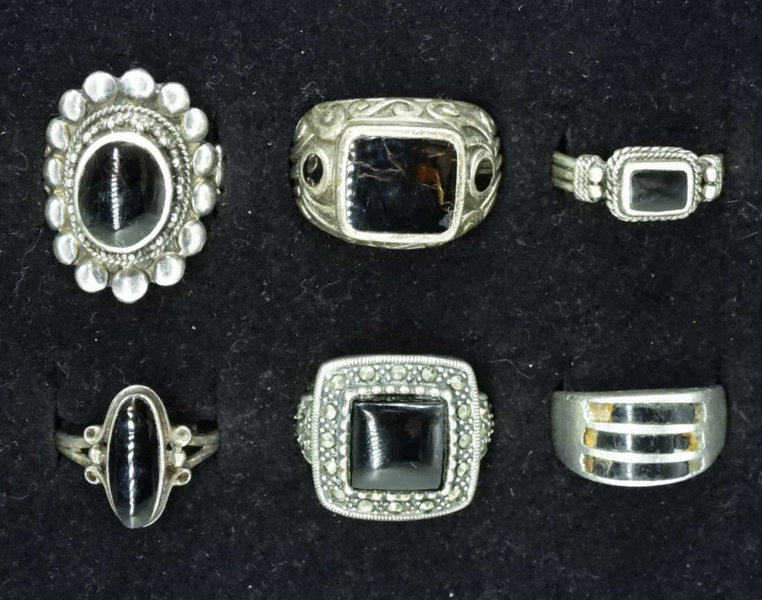 SIX STERLING, BLACK ONYX RINGS. SIZES 7-9 TWO RINGS HAVE CRACKED / BROKEN STONES. SEE PHOTOS! (29 DWT)