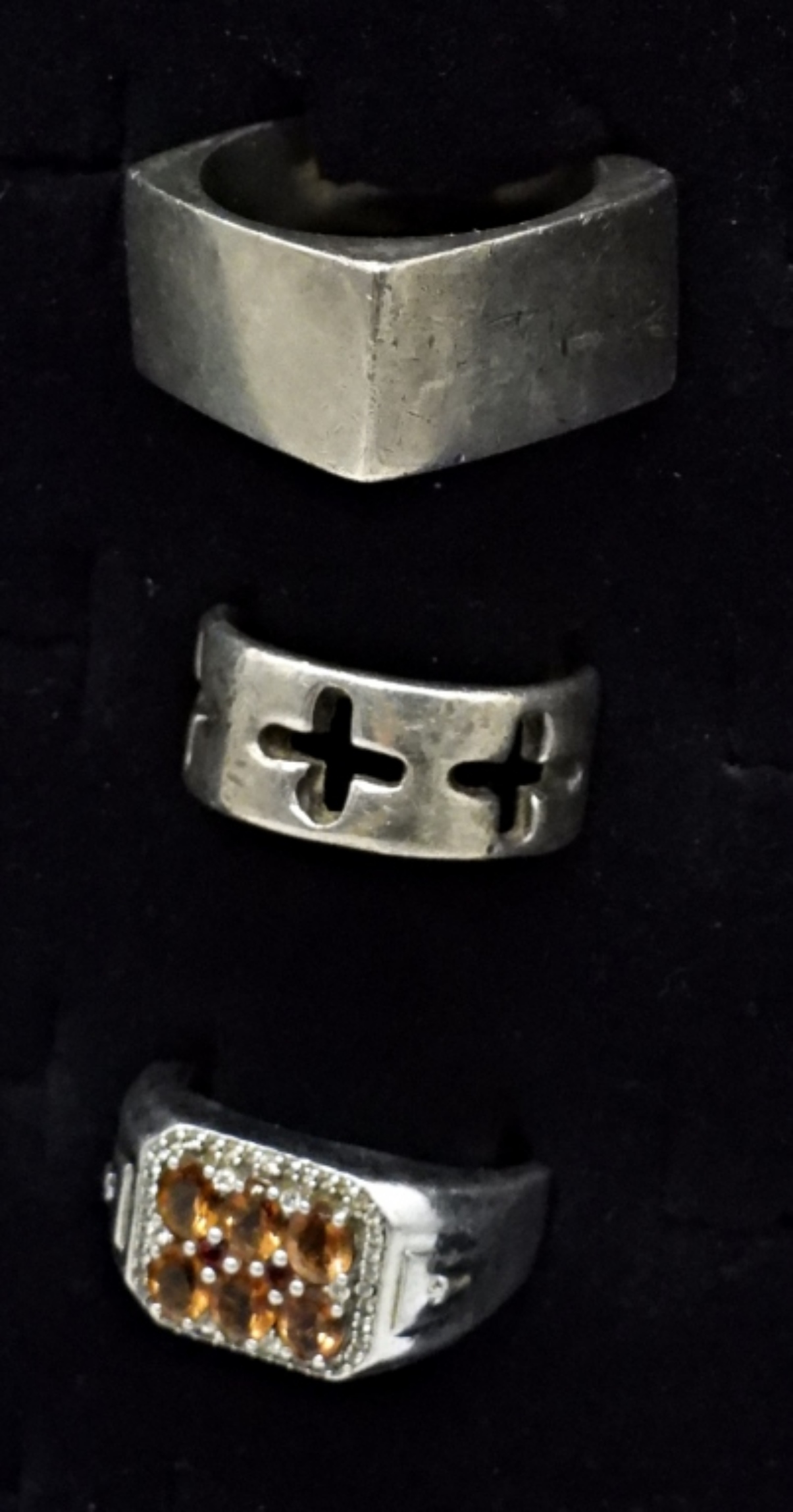 THREE STERLING MEN’S RIGS, ONE WITH WHAT LOOKS LIKE TOPAZ GEMSTONES. SIZES 10, 12, 13 (28 DWT)