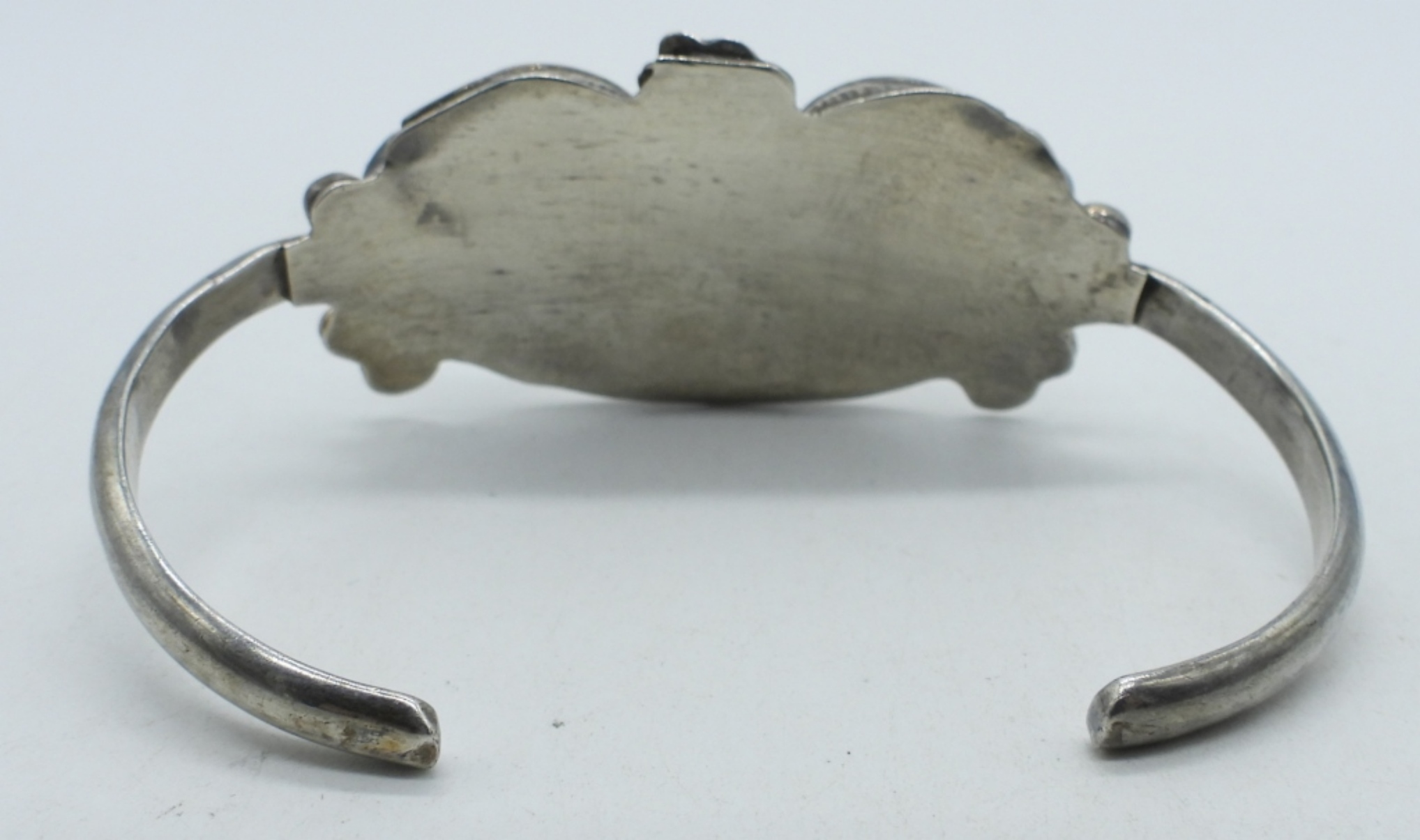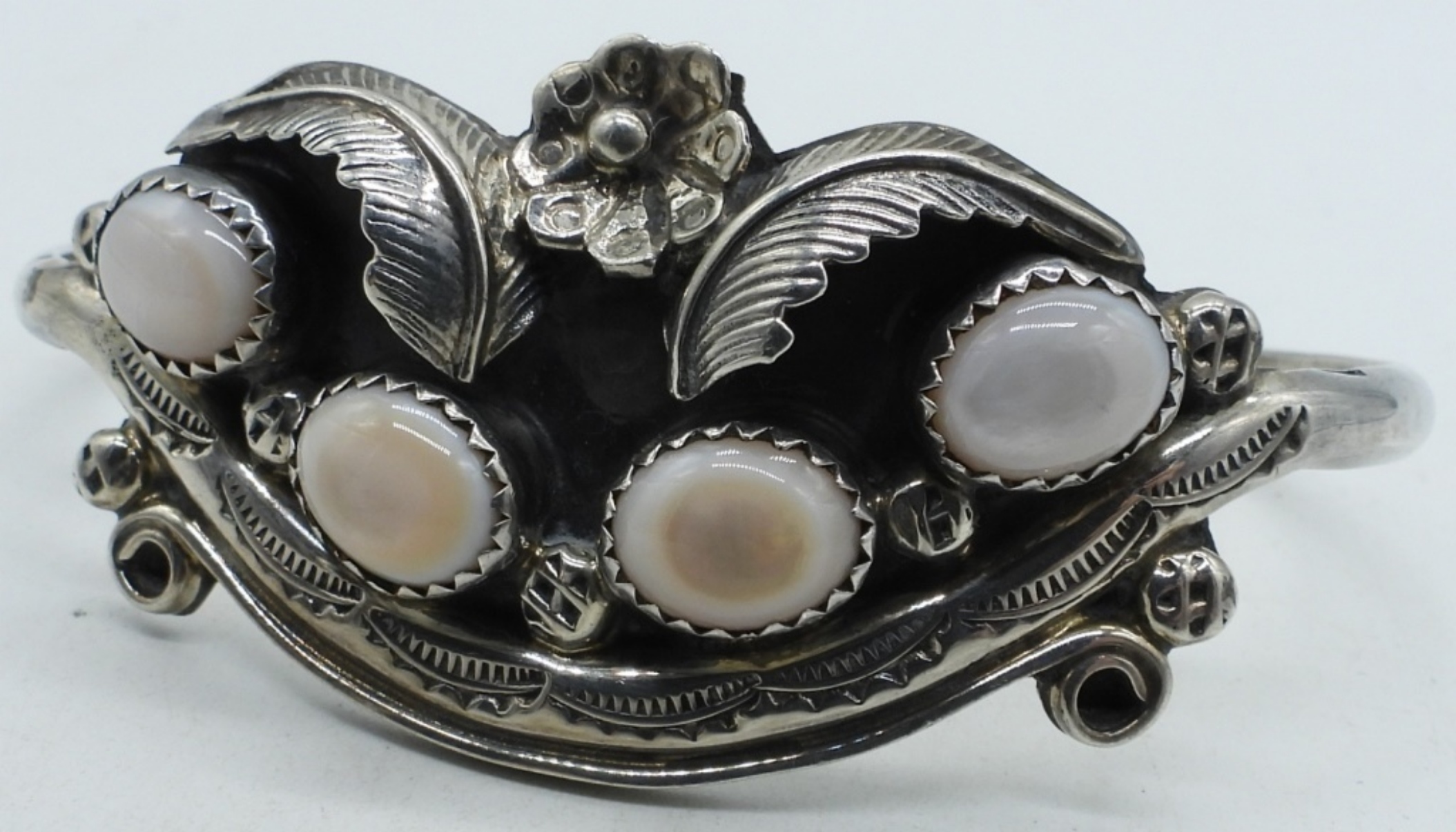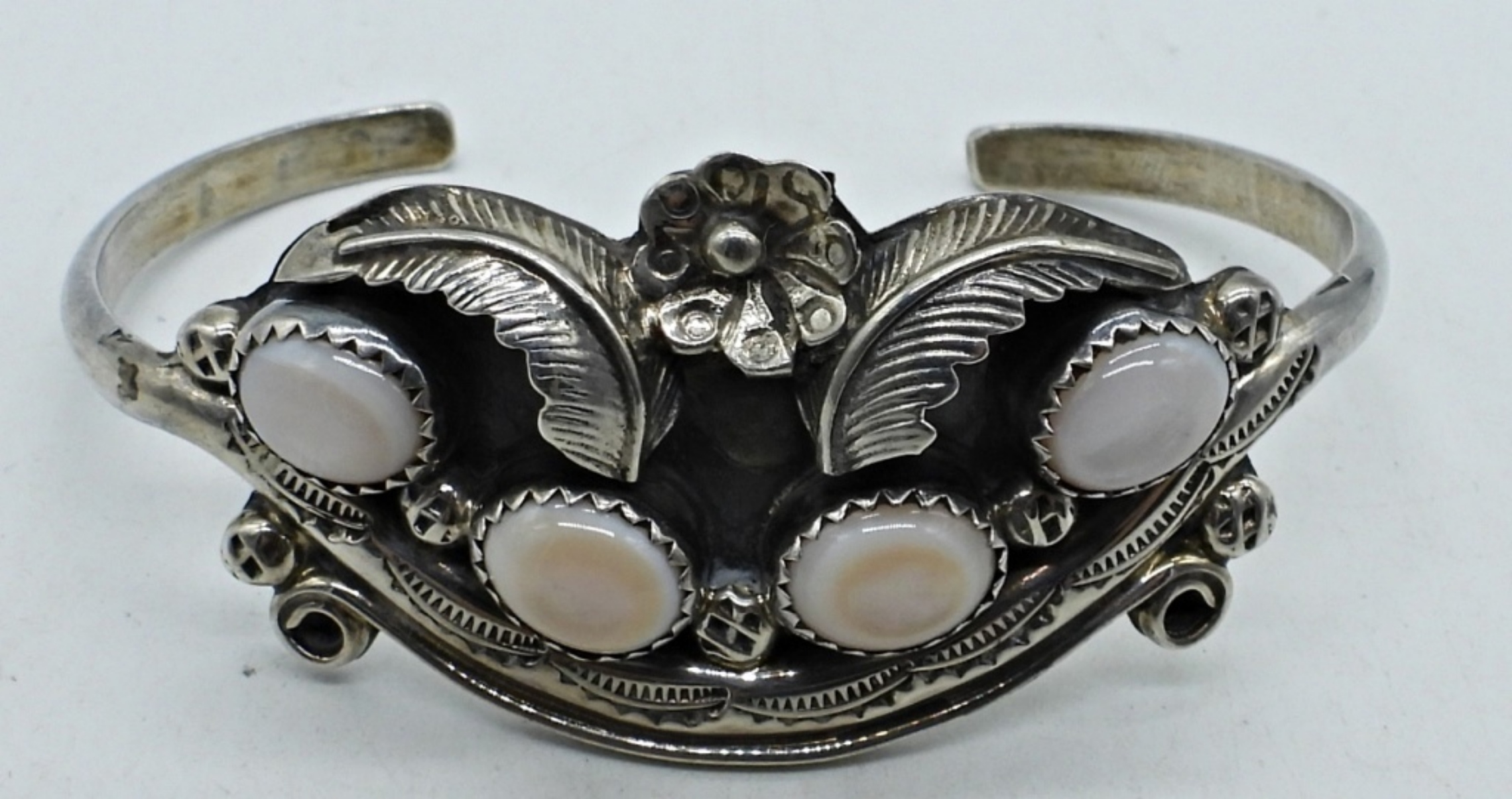 GORGEOUS STERLING CUFF BRACELET, ORNATE, WITH MOTHER OF PEARL GEMSTONES. 6″. (13.2 DWT)