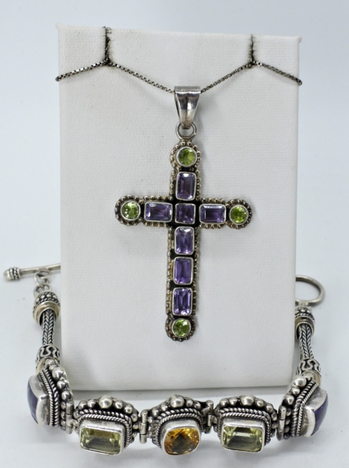 STERLING SILVER BRACELET WITH AMETHYST, PERIDOT & CITRINE GEMSTONES, 7″. 24″ STERLING CHAIN, CROSS NECKLACE WITH AMETHYST & PERIDOT GEMSTONES. CROSS IS 2.5″. (30 DWT)