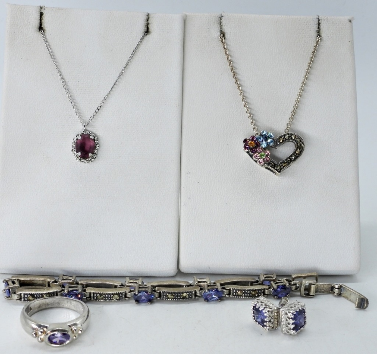 AMETHYST MARCASITE BRACELET, 7.5″. AMETHYST PIERCED EARRINGS & RING, SIZE 5. TWO STERLING NECKLACES, 18-20″. (16.3 DWT)