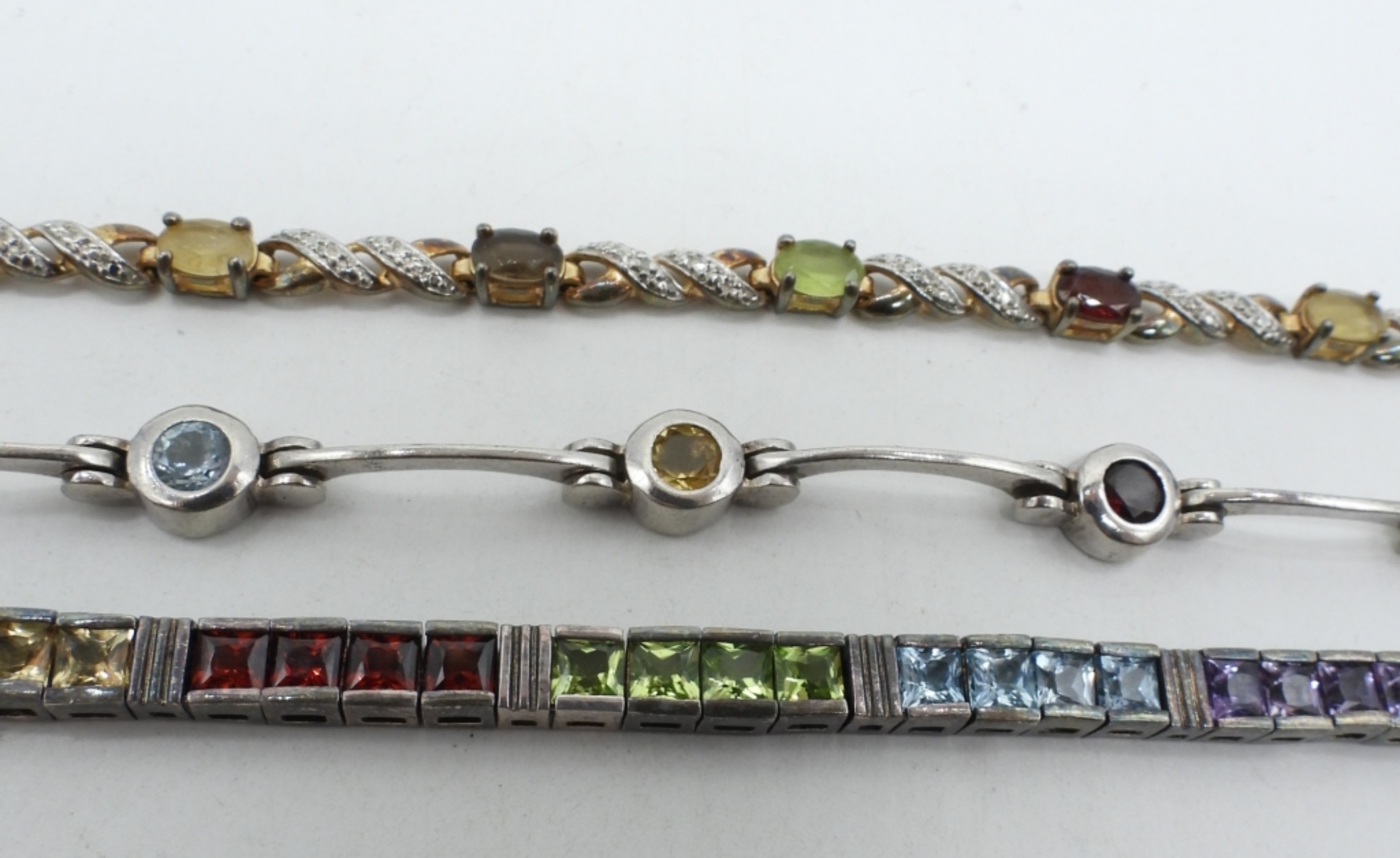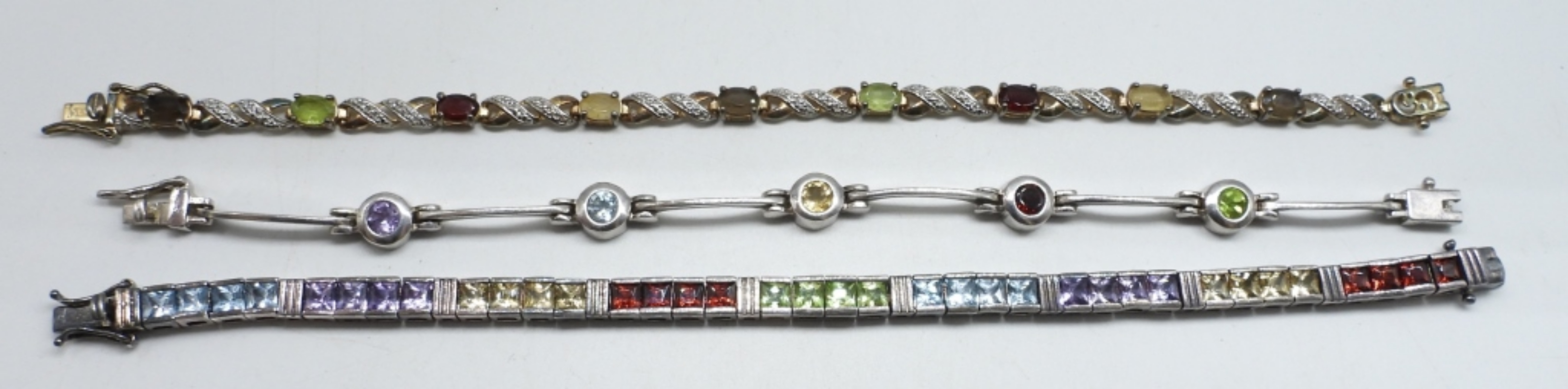 7″ – 7.5″. THREE STERLING BRACELETS. AMETHYST, BLUE TOPAZ, CITRINE, GARNET, PERIDOT GEMSTONES. (26.1 DWT)