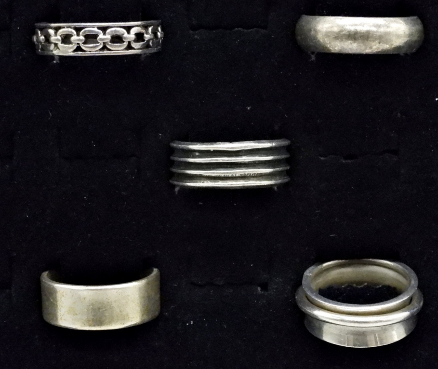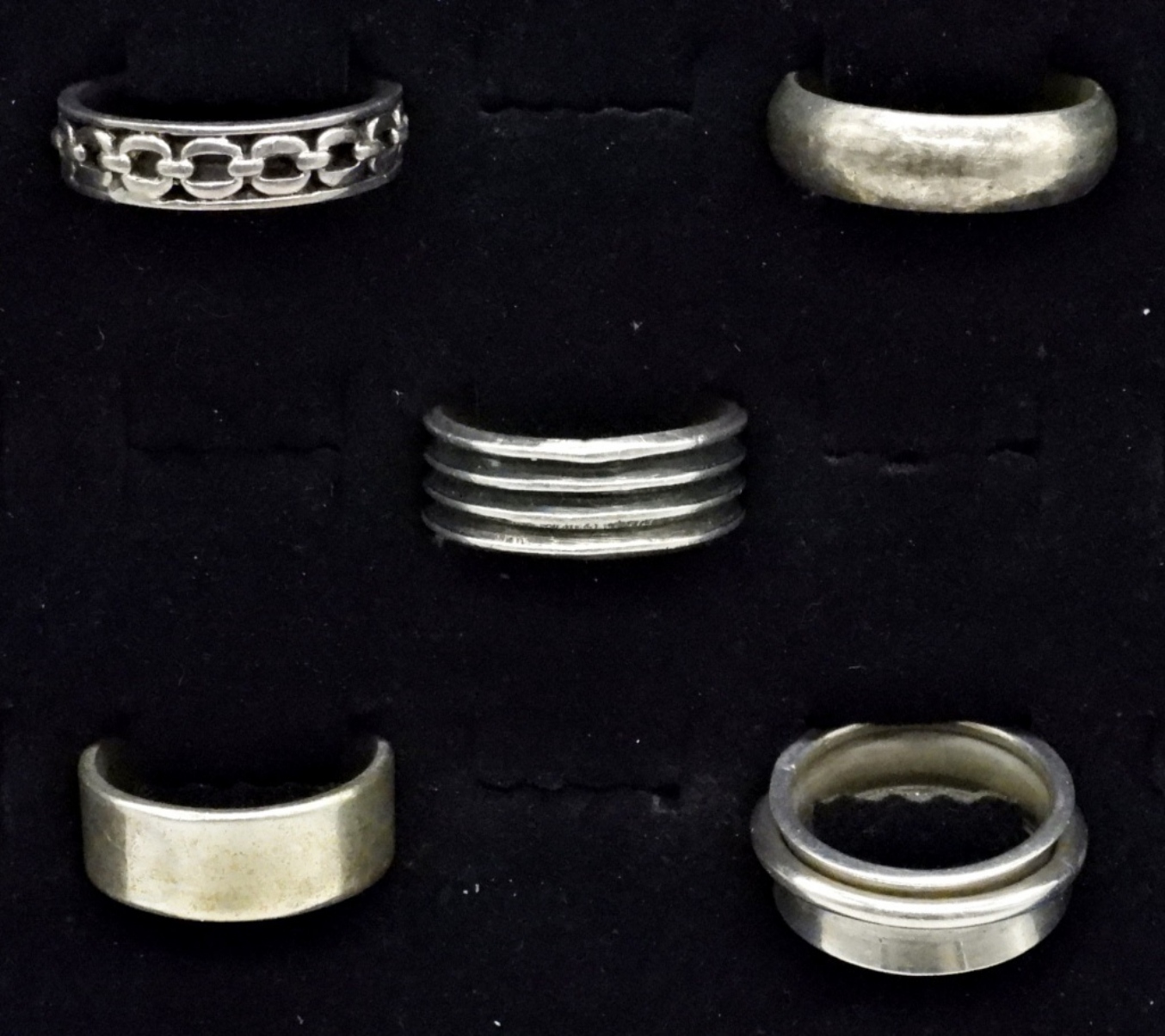 FIVE STERLING RINGS / BANDS. SIZES 12, 14, 15 (35.1 DWT)