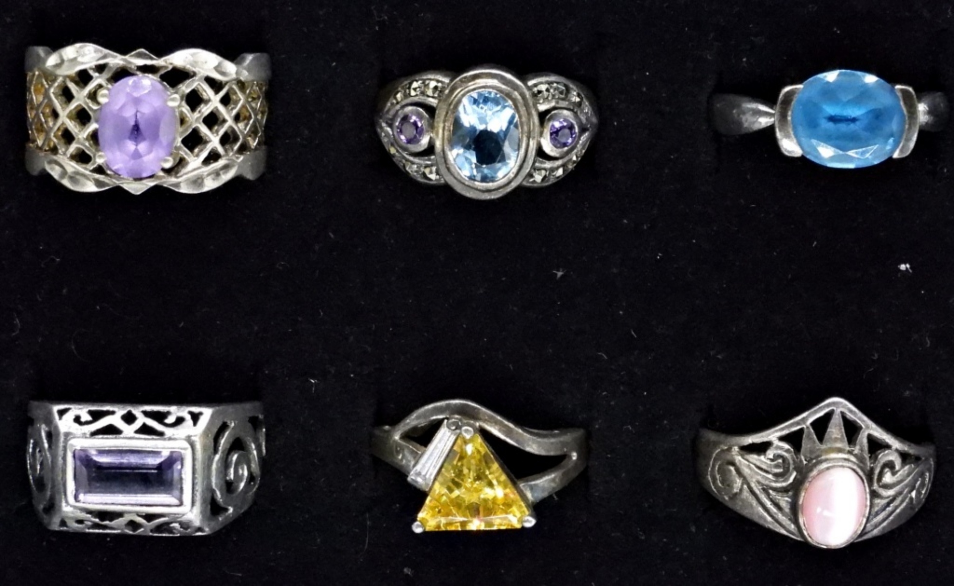 SIX STERLING RINGS WITH BLUE TOPAZ, CITRINE, PINK CATS EYE, AMETHYST GEMSTONES. SIZES 6-9 (16.3 DWT)