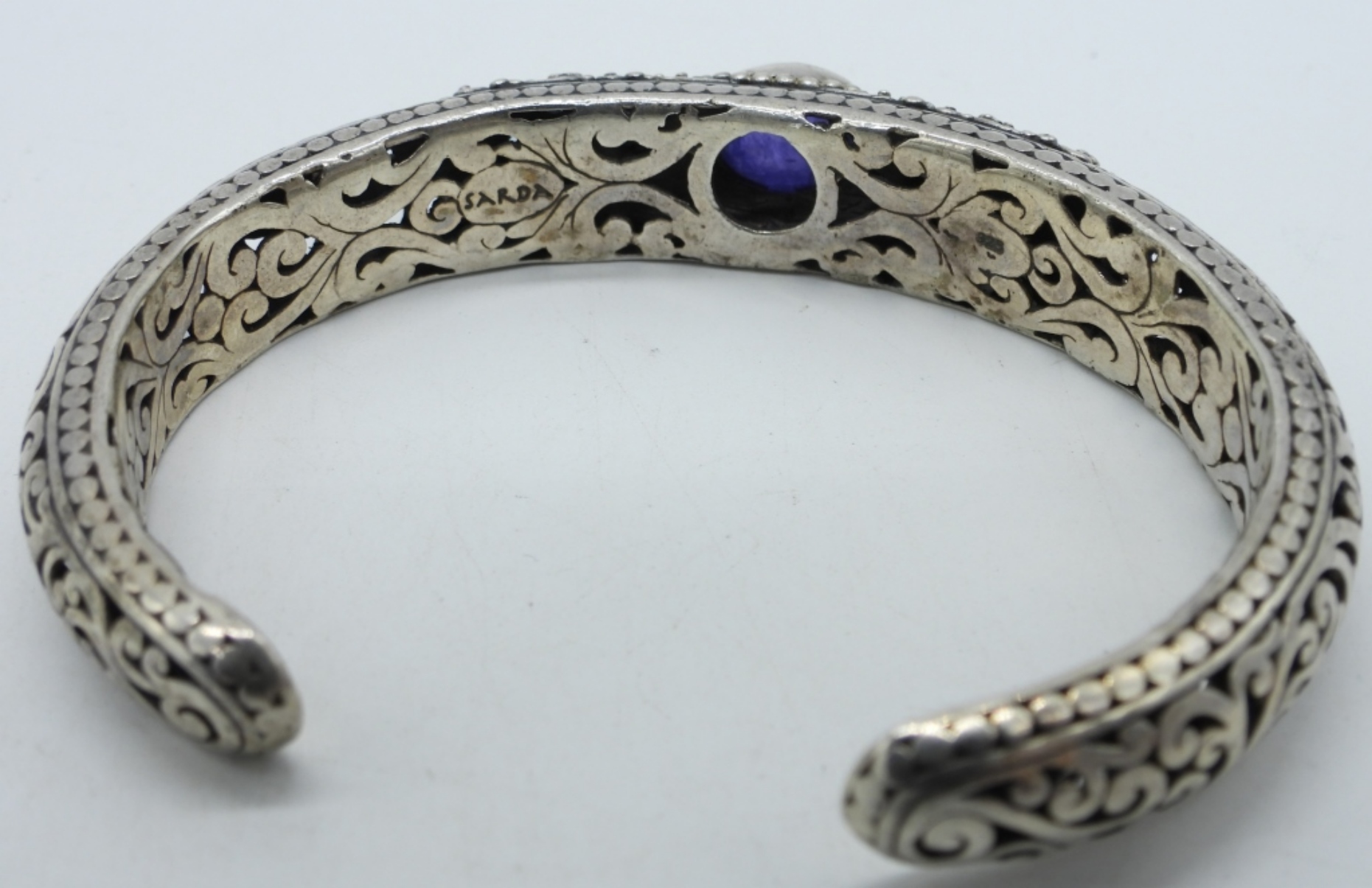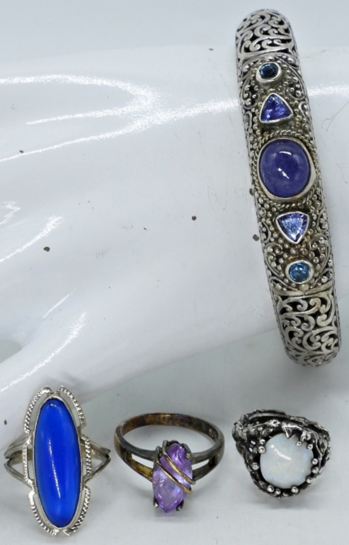 SARDA STERLING CUFF BRACELET WITH AMETHYST GEMSTONES. 7″. THREE STERLING RINGS, SIZES 5.5, 6, 8. (27.6 DWT)