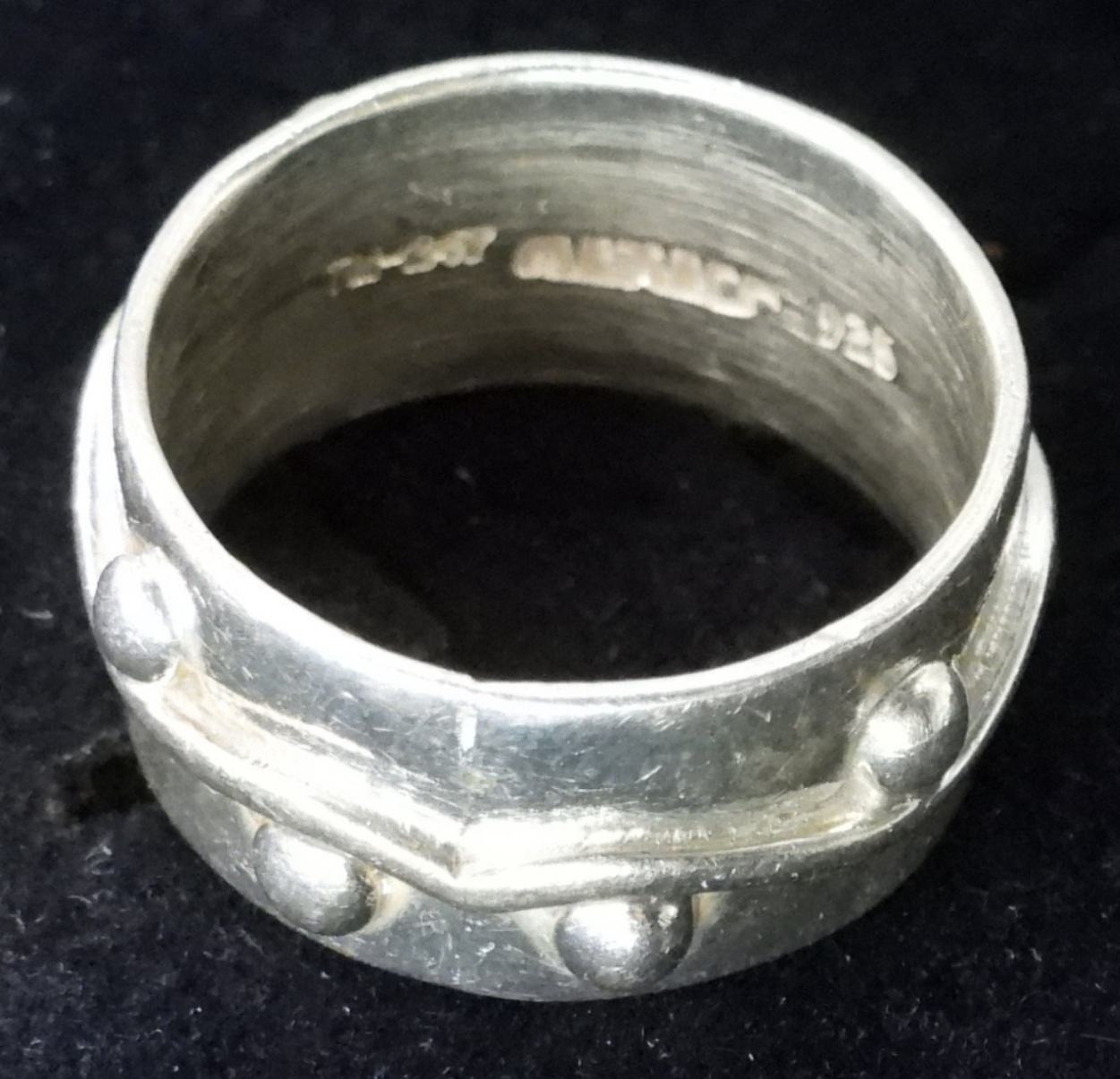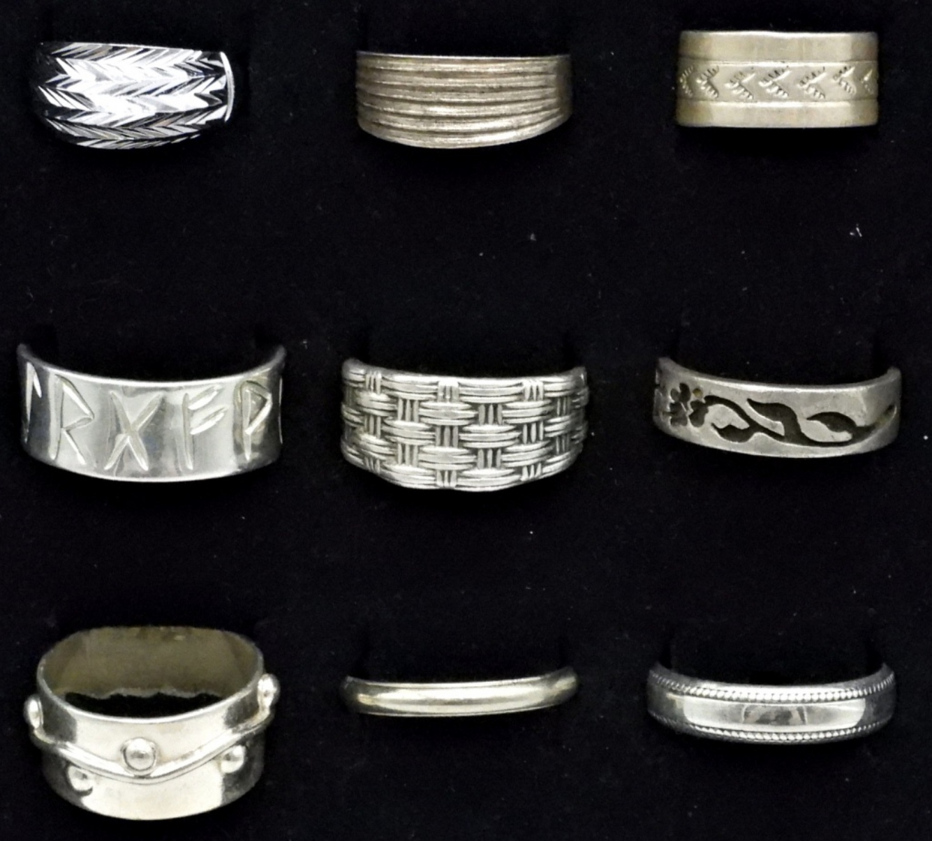 NINE STERLING RINGS. ONE IS TAXCO, MARKED TM-247 925, SIZE 9. OTHER RINGS ARE 6-11 (33 DWT)