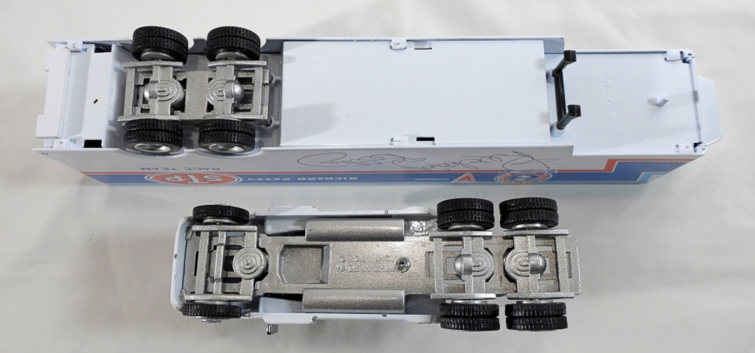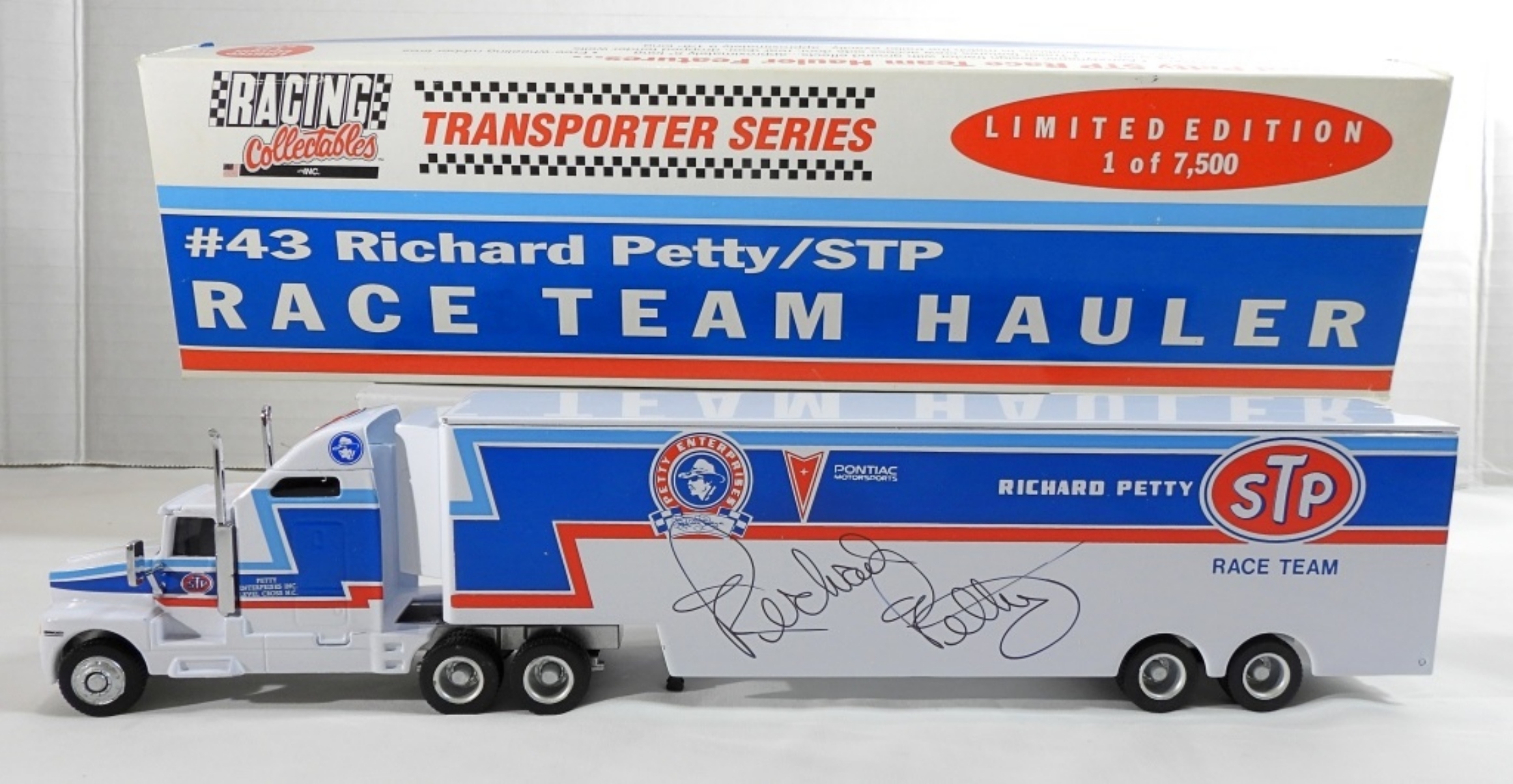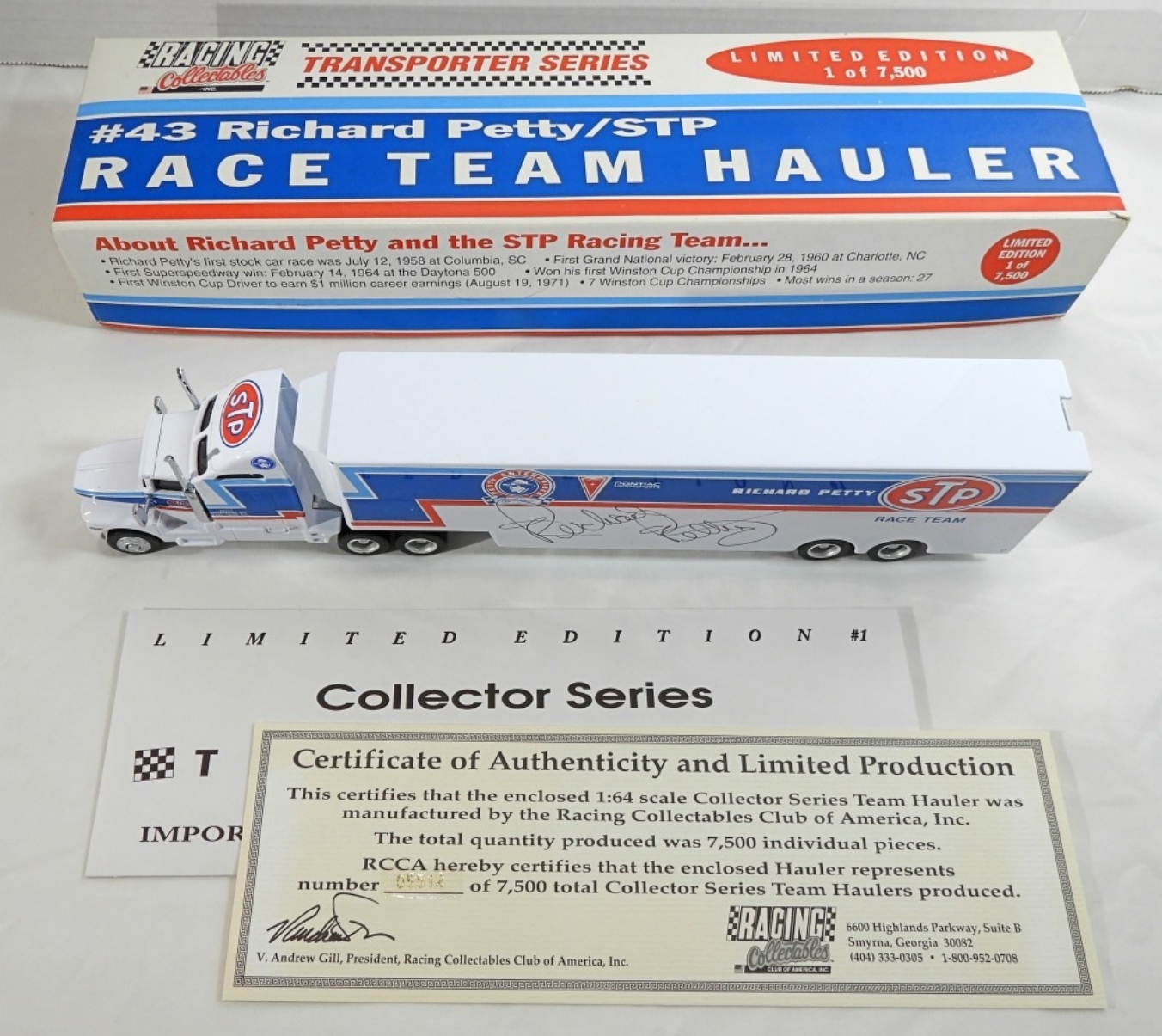1:64, AUTOGRAPH IS UNVERIFIED, LIMITED EDITION 1 OF 7,500 FROM RACING COLLECTABLES INC. TRANSPORTER SERIES, #43 RICHARD PETTY/STP, STILL IN ORIGINAL BOX, DOES HAVE A COA FROM RACING COLLECTABLES INC. #05512 OF