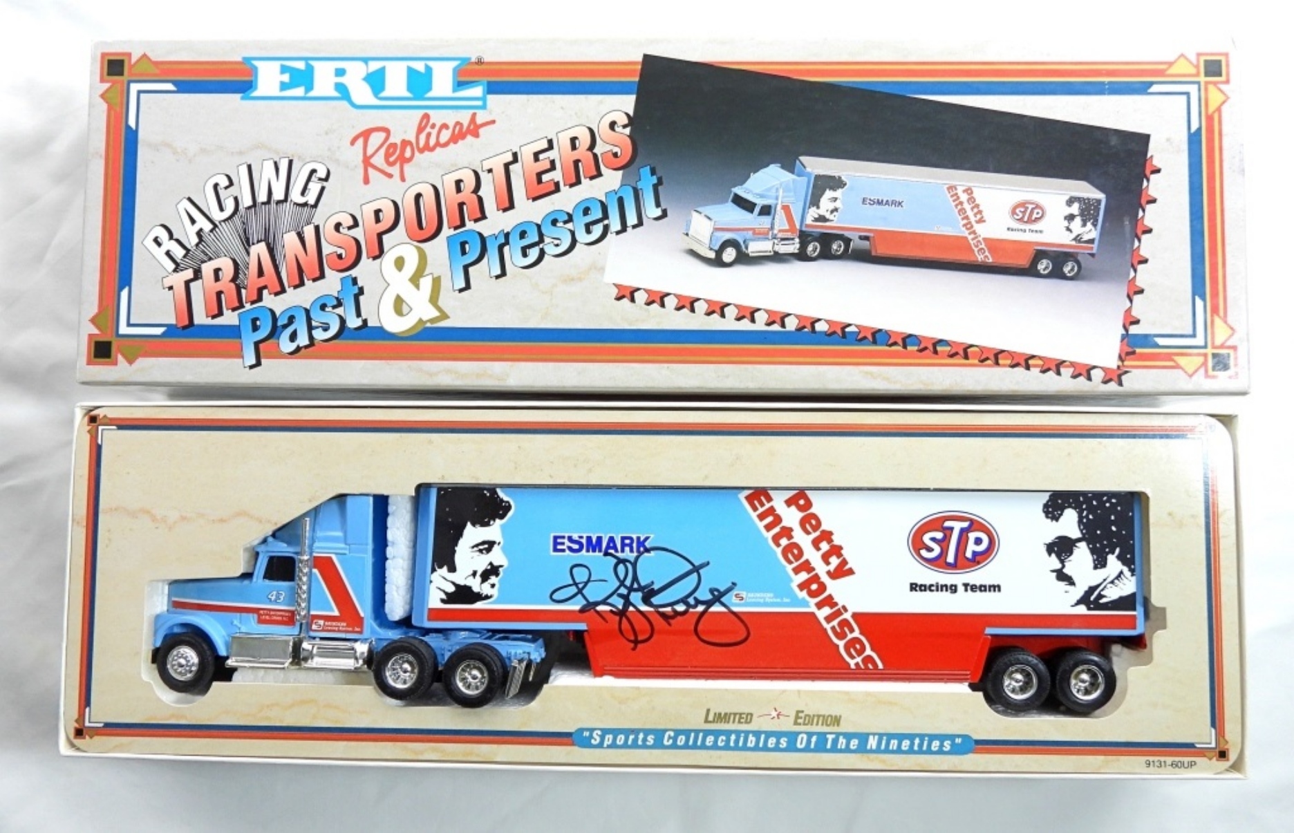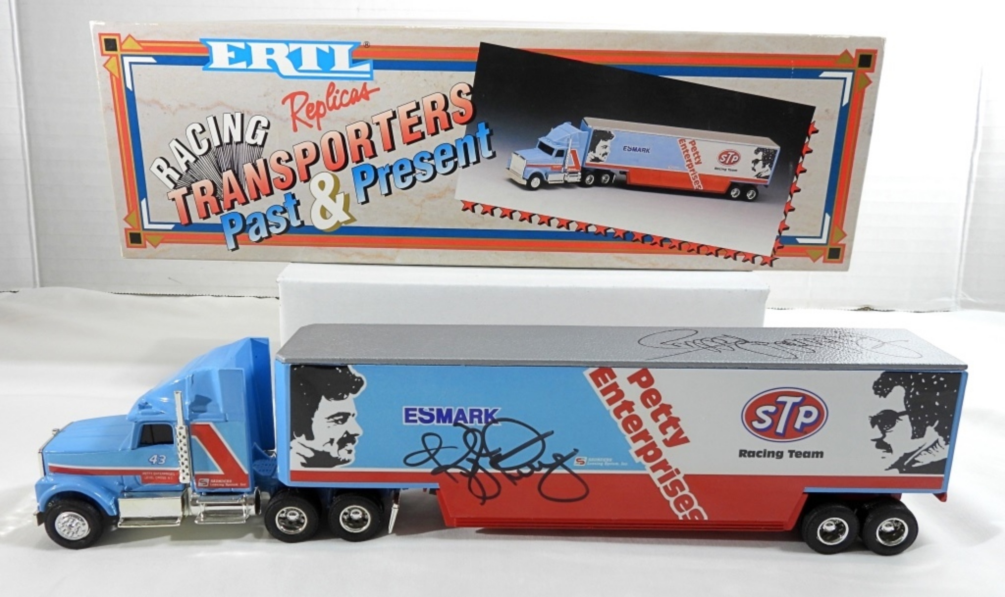 AUTOGRAPH IS UNVERIFIED, LIMITED EDITION RACING TRANSPORTERS PAST & PRESENT, 1:64, STILL IN ORIGINAL BOX