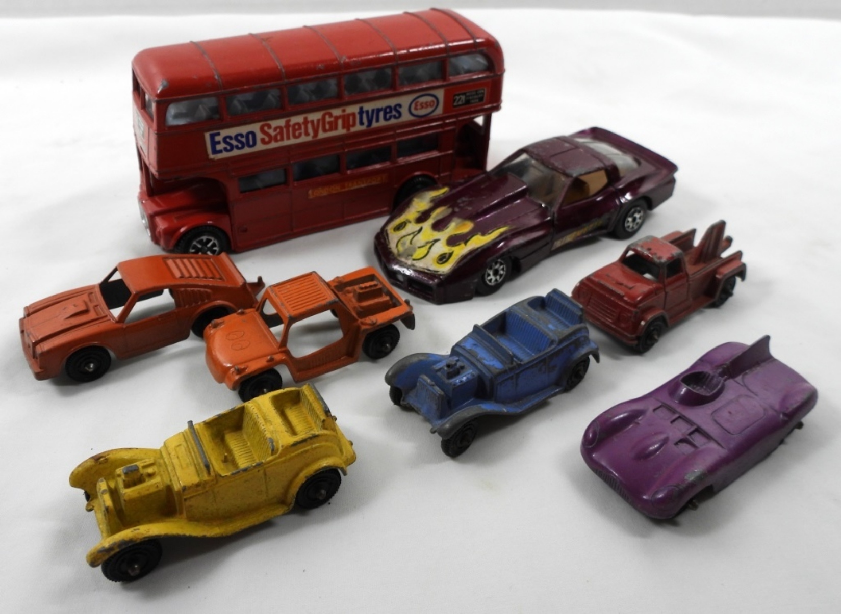 8 VINTAGE METAL TOY LOT- 6 MINI METAL TOYS- 2 TRUCKS & 4 HOTRODS. ESSO SAFETY GRIP TYRES (ESSO)- THE BUS IS MISSING ONE WHEEL, A CORVETTE- FIREVETTE. ALL HAVE BEEN PREOWNED AND DO SHOW SWEAR TO THE PAINT, AND TO THE