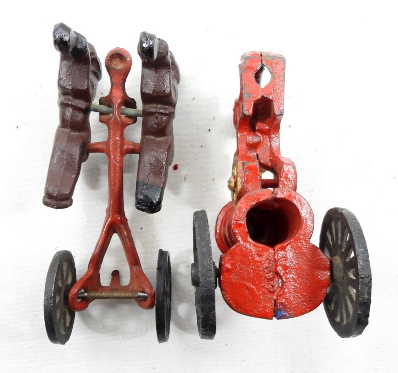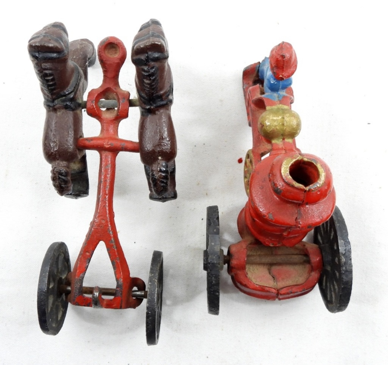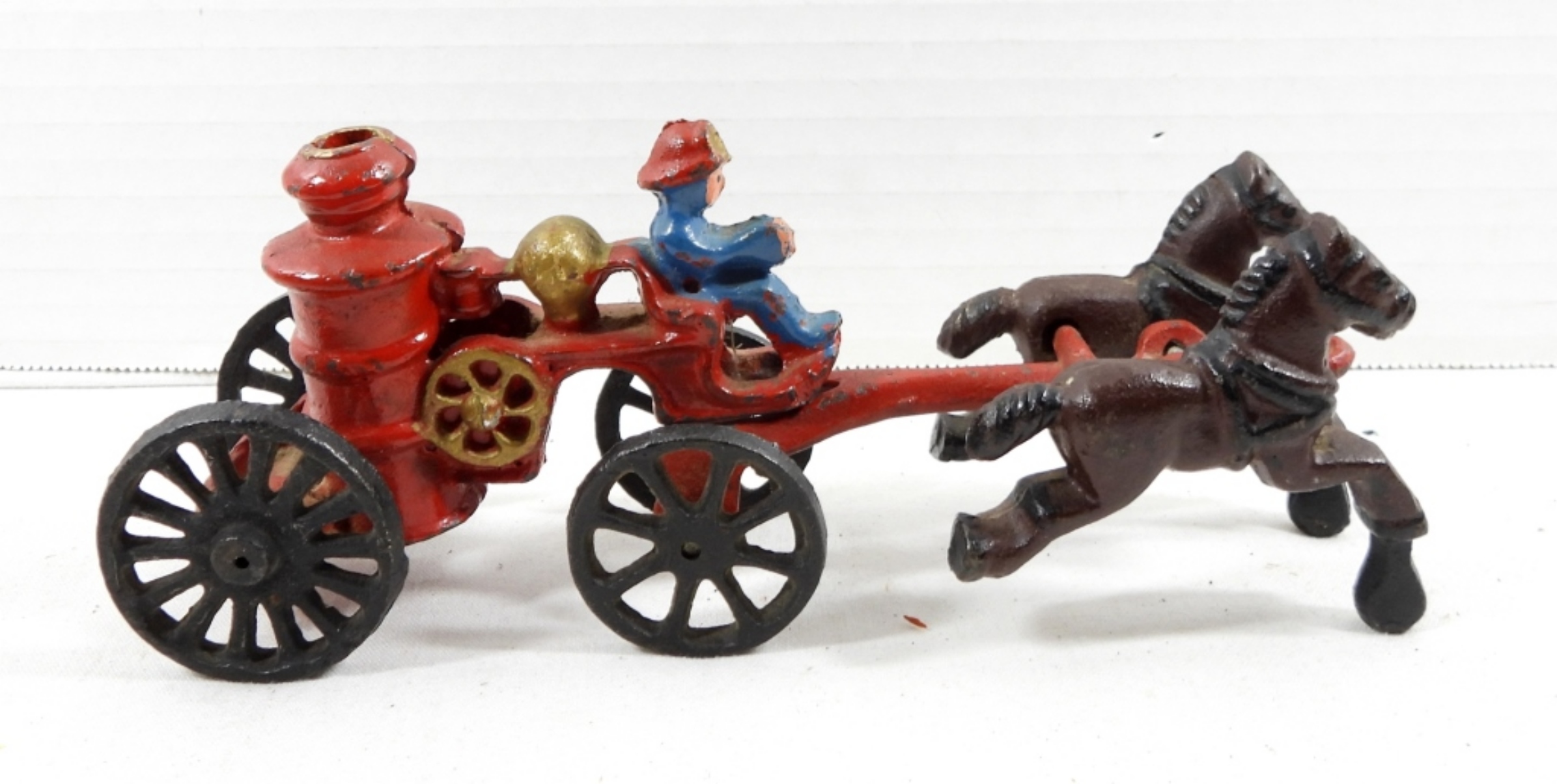 VINTAGE CAST IRON FIREMAN FIRE PUMPER WAGON HORSE DRAWN FIRE TRUCK TOY (2 PIECE )