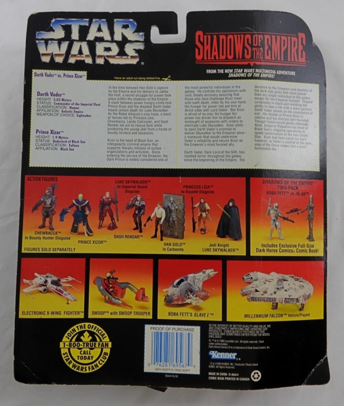 PRINCE XIZOR VS. DARTH VADER STAR WARS SHADOWS OF THE EMPIRE FIGURES, COMES WITH COMIC FROM DARK HORSE COMICS FIGURES FROM KENNER TOYS. THE PACKAGE WAS BENT IN SOME AREAS, AND PLASTIC IS LIFTING AS WELL
