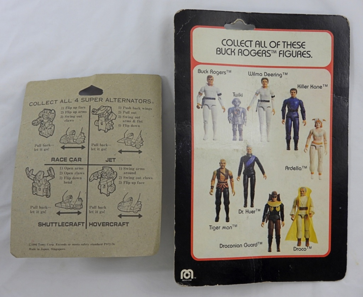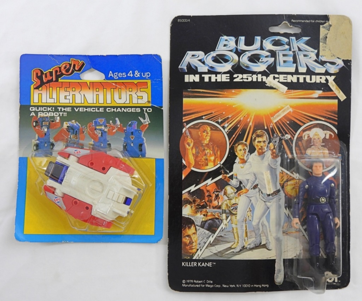 1979 FROM MEGO CARP. BUCK ROGERS IN THE 25TH CENTURY KILLER KANE, PACKAGING HAS WEAR AND BENT, PLUS 1986 TOMY SUPER ALTERNATORS HOVERCRAFT
