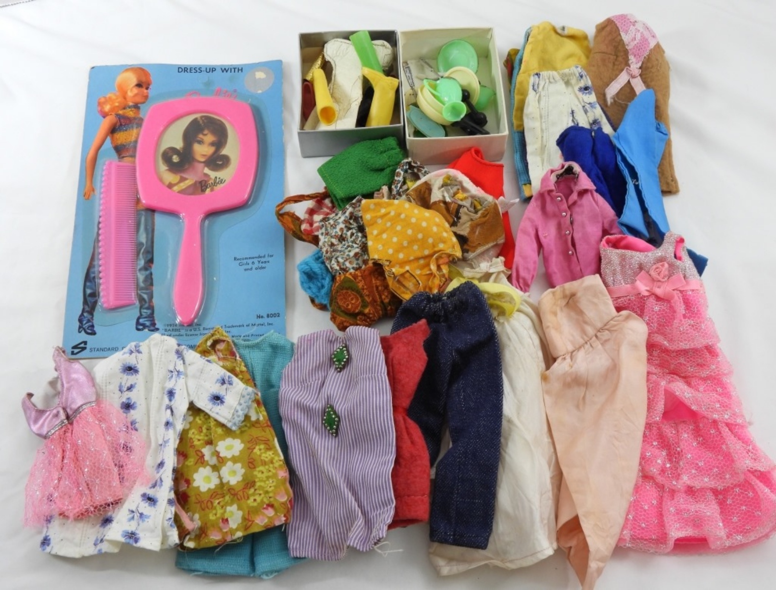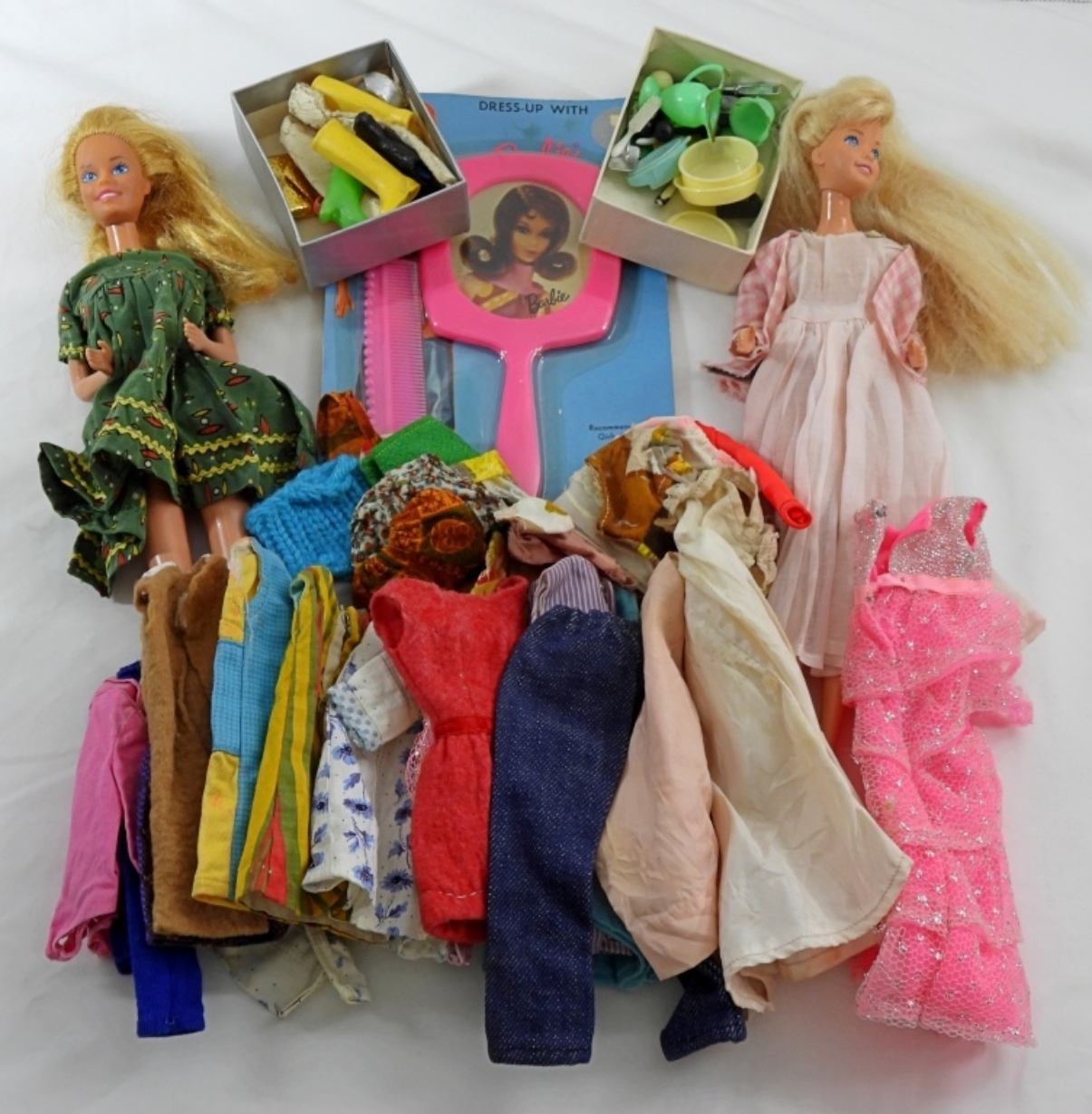 1 DOLL FROM 1966 AND 1 FROM 1975, BOTH DOLLS ARE STILL IN NICE CONDITION, WITH NORMAL WEAR FROM THE YEARS. MANY CLOTHES WITH SHOES AND ALSO ACCESSORIES, PLUS A BARBIE MIRROR AND A COMB IN PACKAGE.