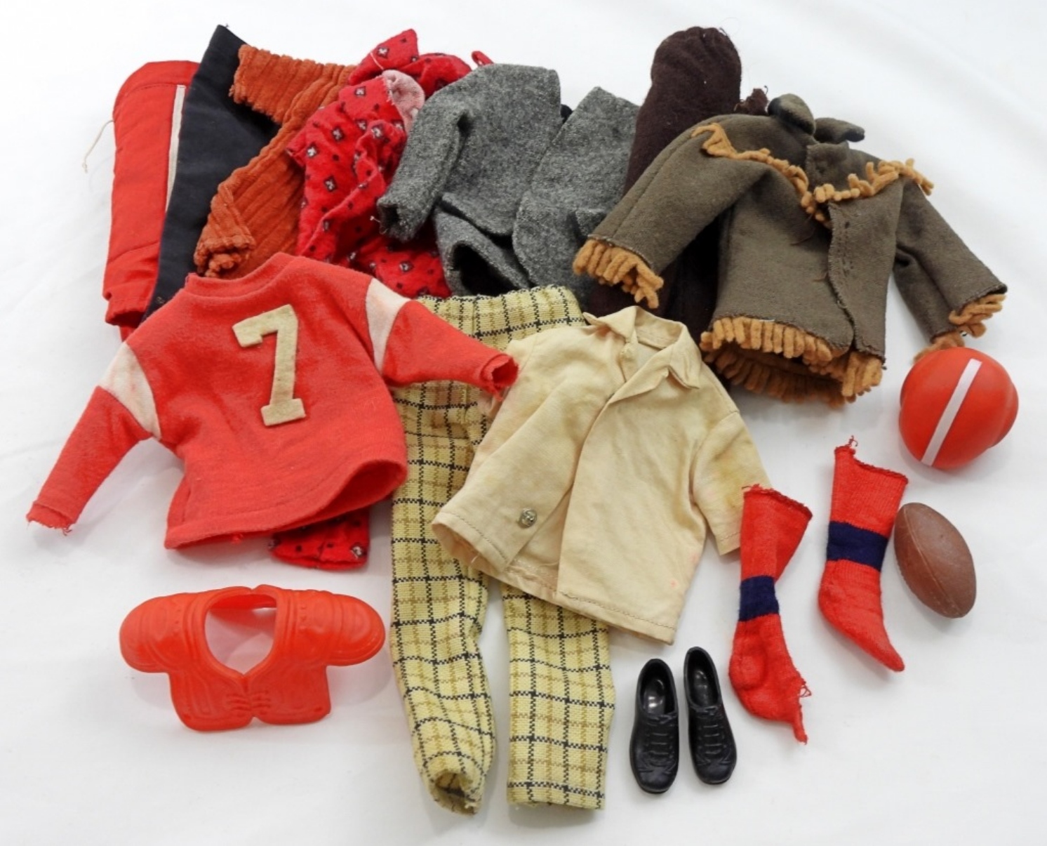 1 KEN DOLL WITH STAMPING ON BUTT WITH KEN PATS PENDING. MATTLE, KEN DOLL HAS NORMAL WEAR FROM THE YEARS, COMES WITH COMPLETE FOOTBALL SET, PLUS MORE KEN CLOTHES