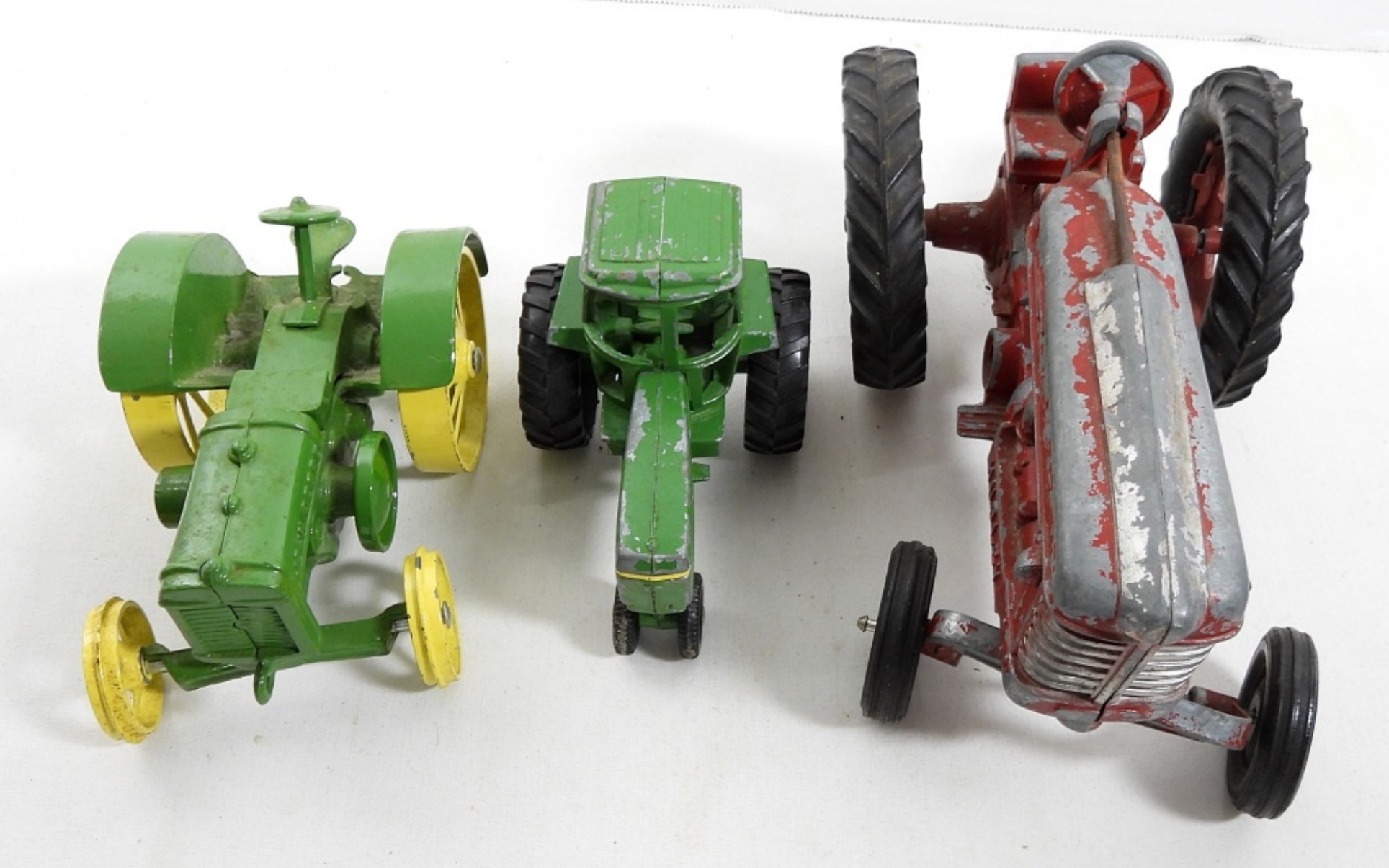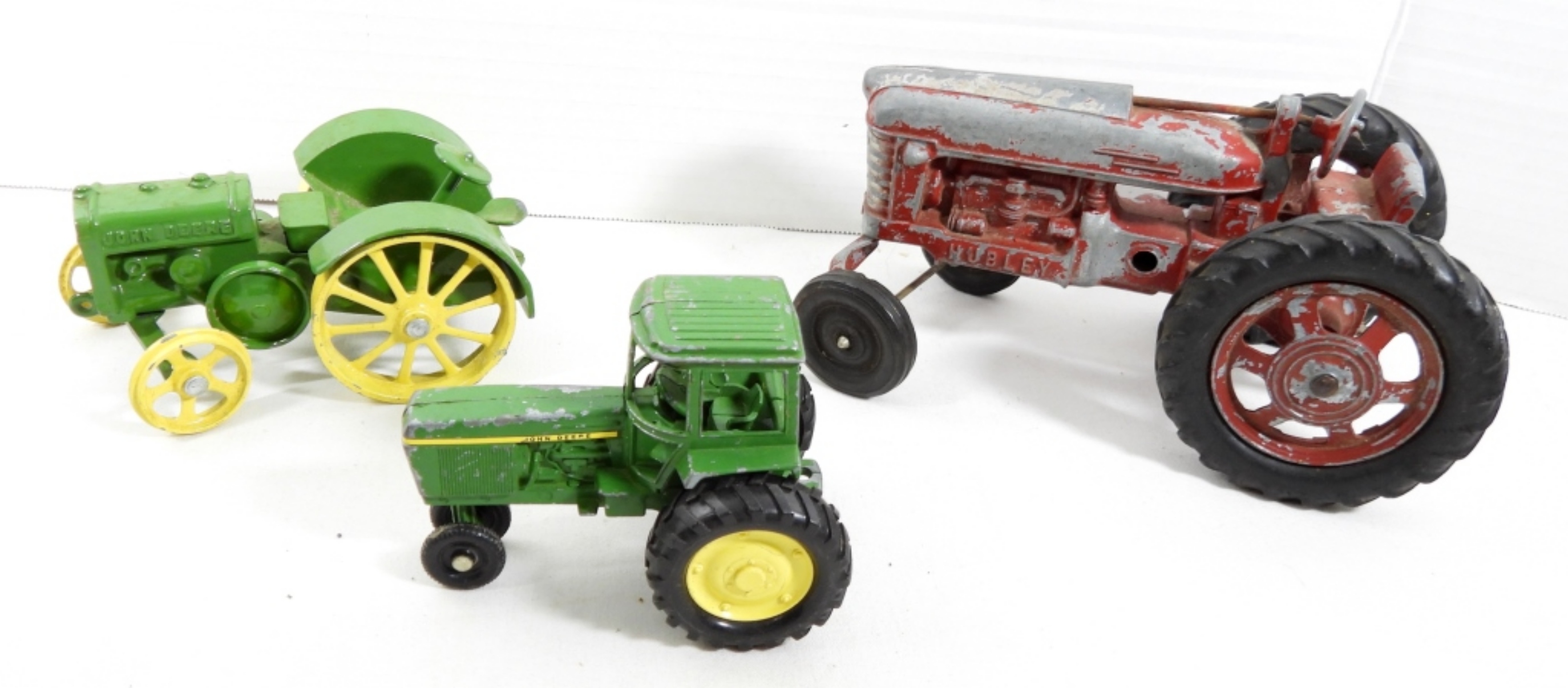 (3) VINTAGE CAST IRON TRACTORS. 2 JOHN DEER TRACTORS AND 1 RED HUBLEY TRACTOR