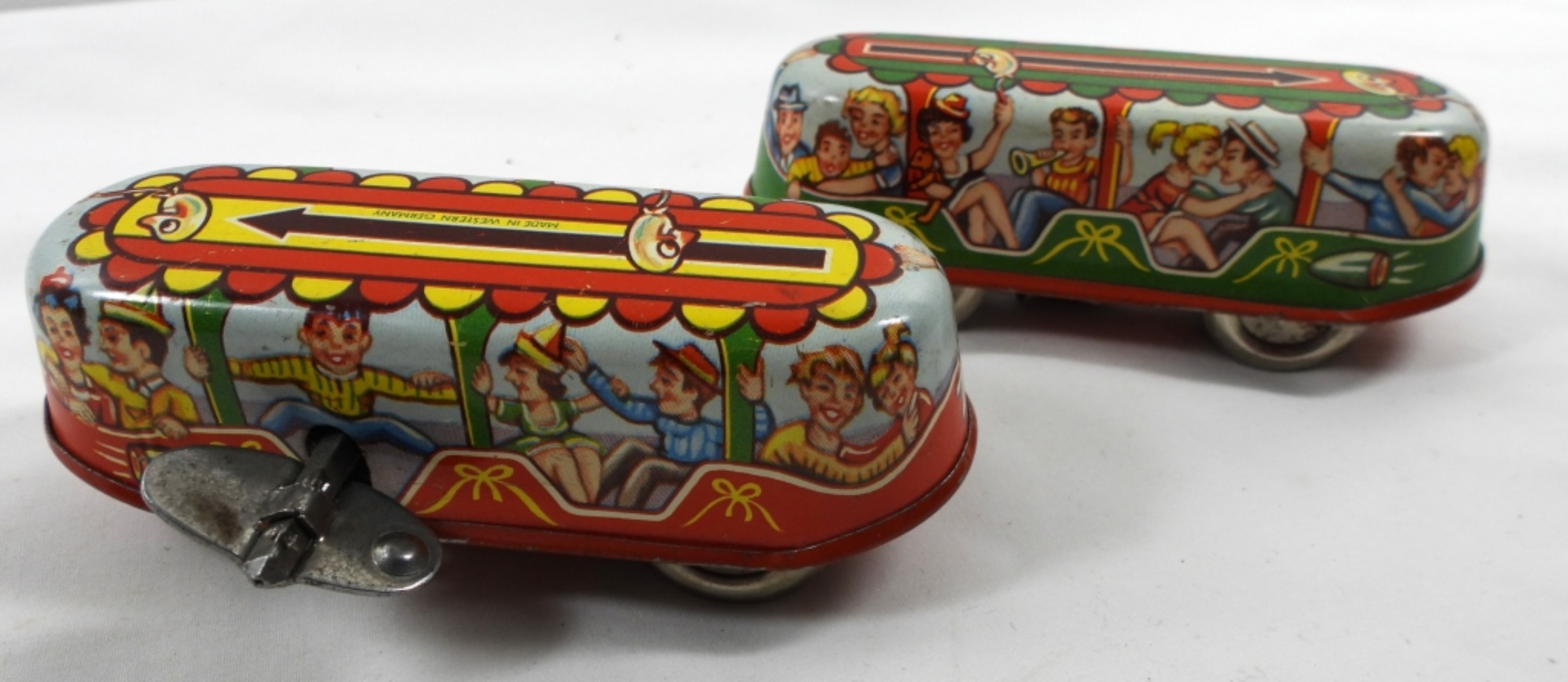 COASTER CARS TIN WIND UP TOYS IN FAIR TO GOOD CONDITION- BOTH OF THEM WIND BUT SOMETIMES THE WHEELS TURN SOMETIMES THEY DON’T. PREOWNED.