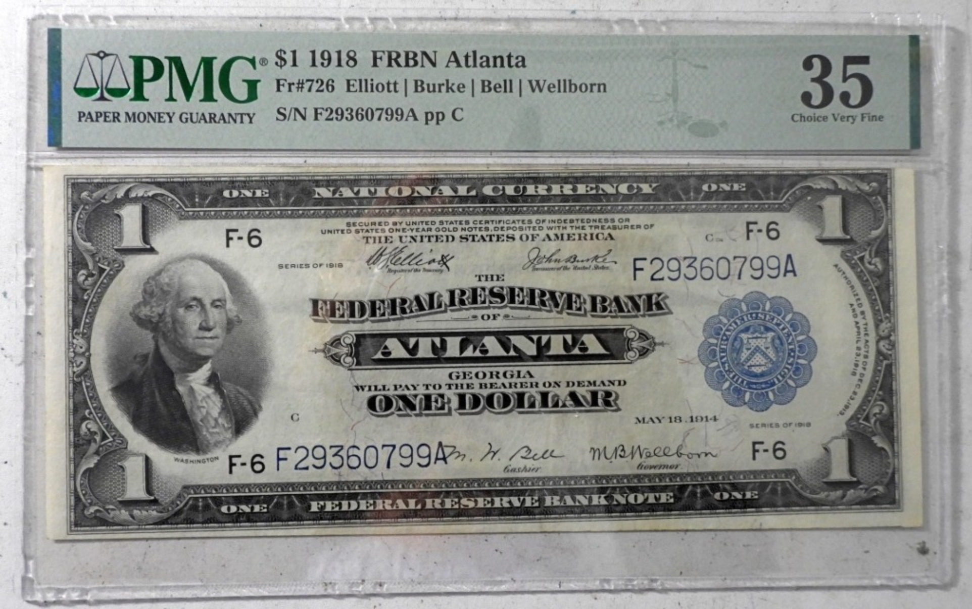 ONE DOLLAR, THE FEDERAL RESERVE BANK OF ATLANTA GEORGIA, FR#726, ELLIOTT, BURKE, BELL, WELLBORN, S/N F29360799A PP C, 35 CHOICE VERY FINE