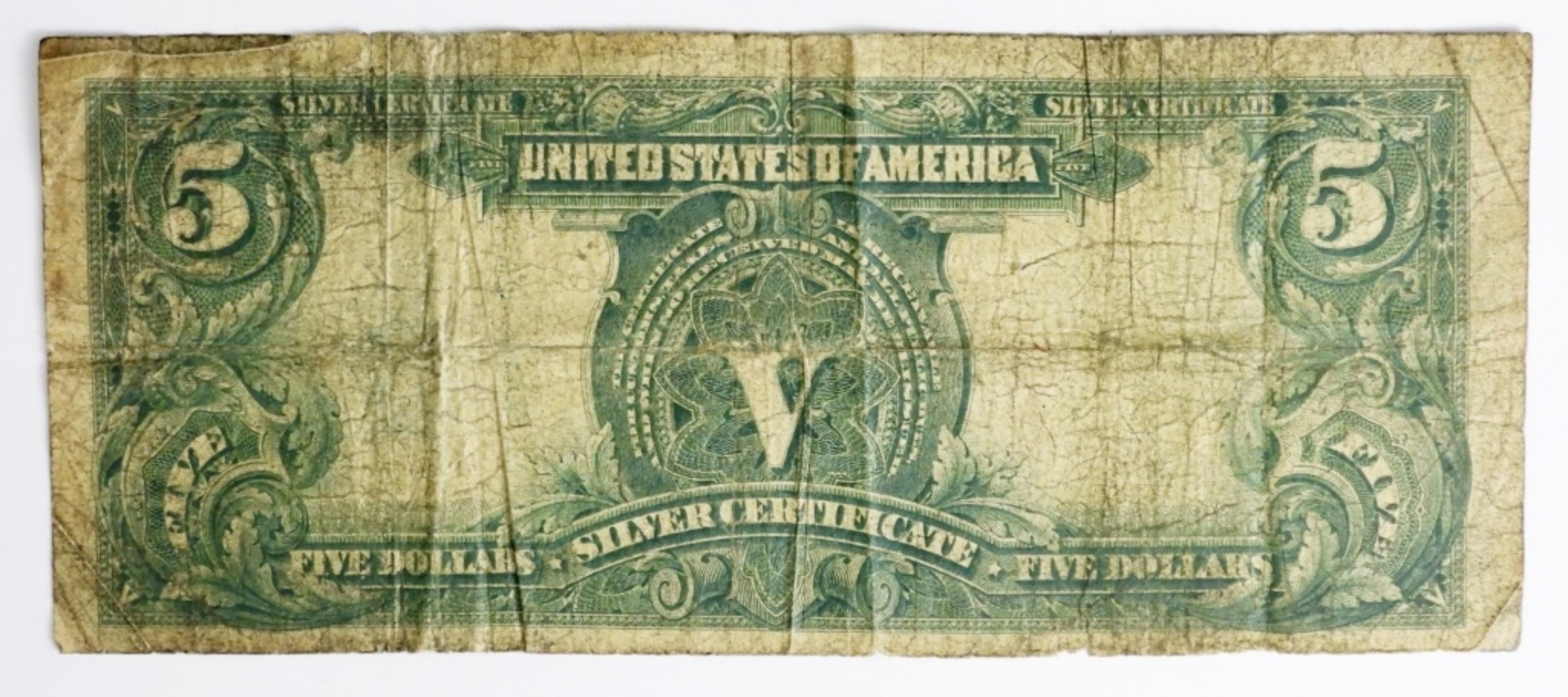 1899 $5 SILVER CERTIFICATE, INDIAN CHIEF HEAVILY CIRCULATED. HISTORICAL PIECE