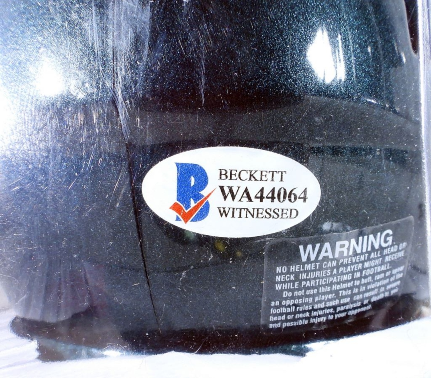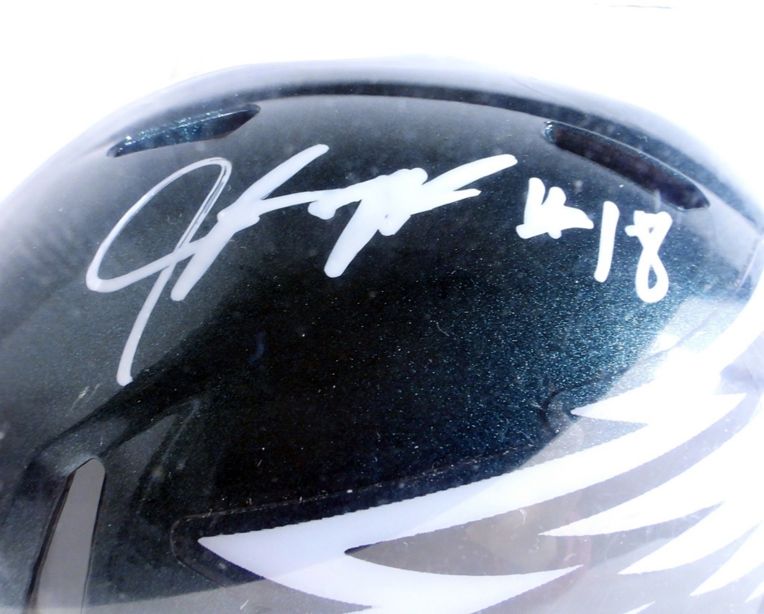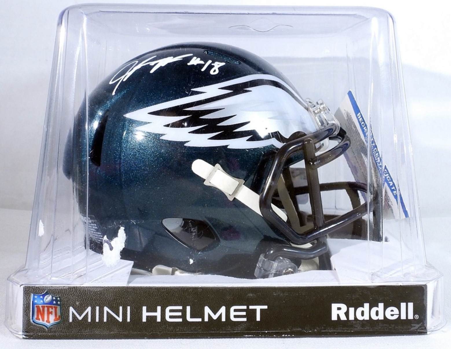 JALEN REAGOR #18 AUTO EAGLES MINI RIDDELL HELMET BECKETT WITNESSED STICKER #WA44064