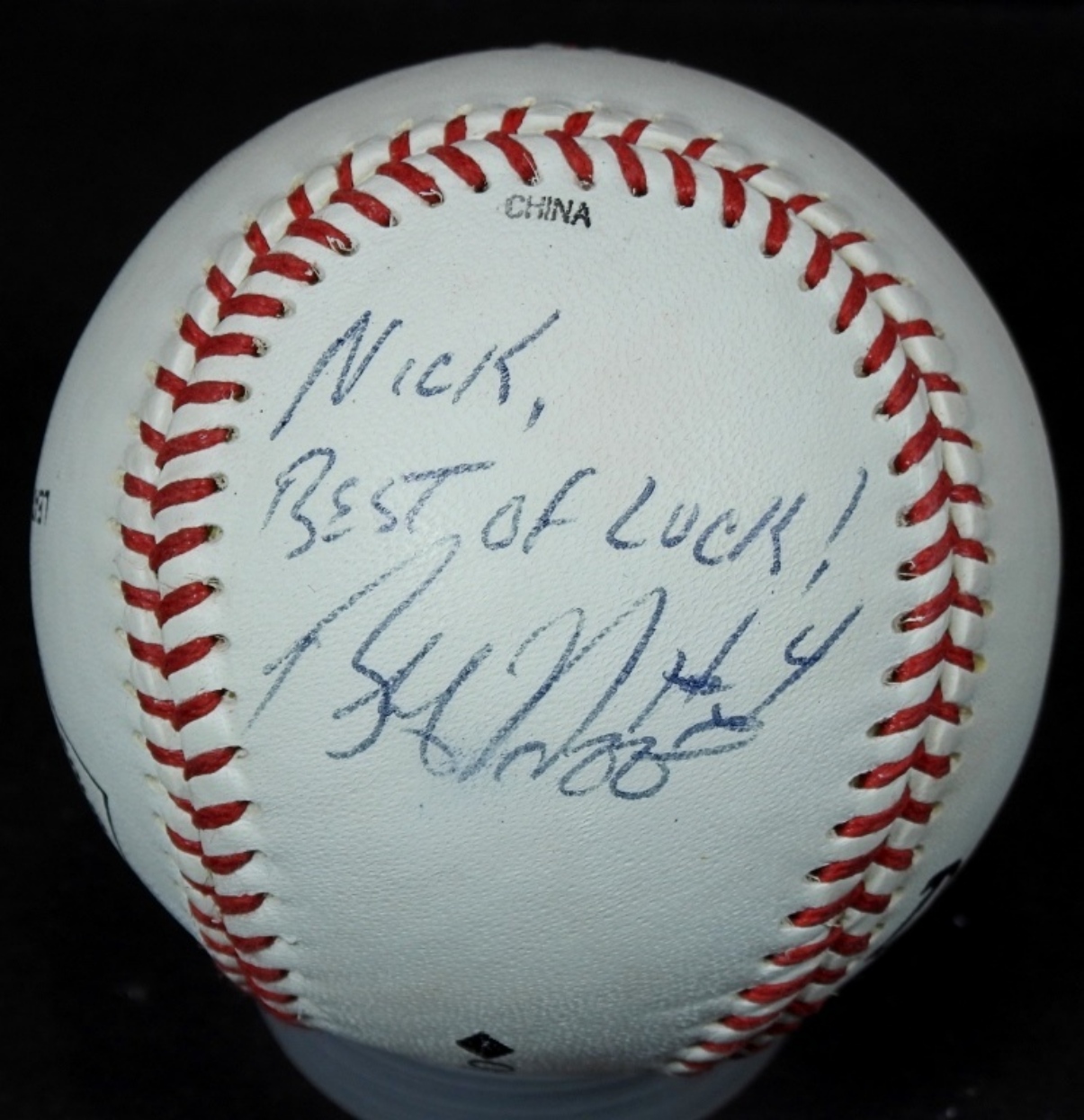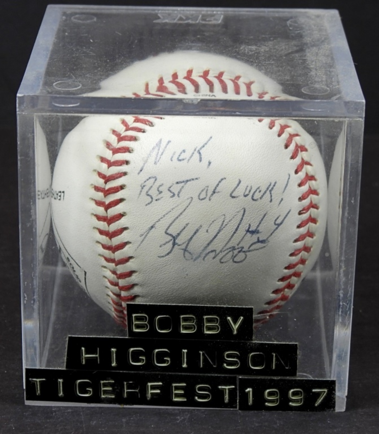 “TO NICK” BOBBY HIGGINSON TIGERFEST 97 AUTOGRAPHED BASEBALL, UNVERIFIED, IN PROTECTIVE CASING NO COA